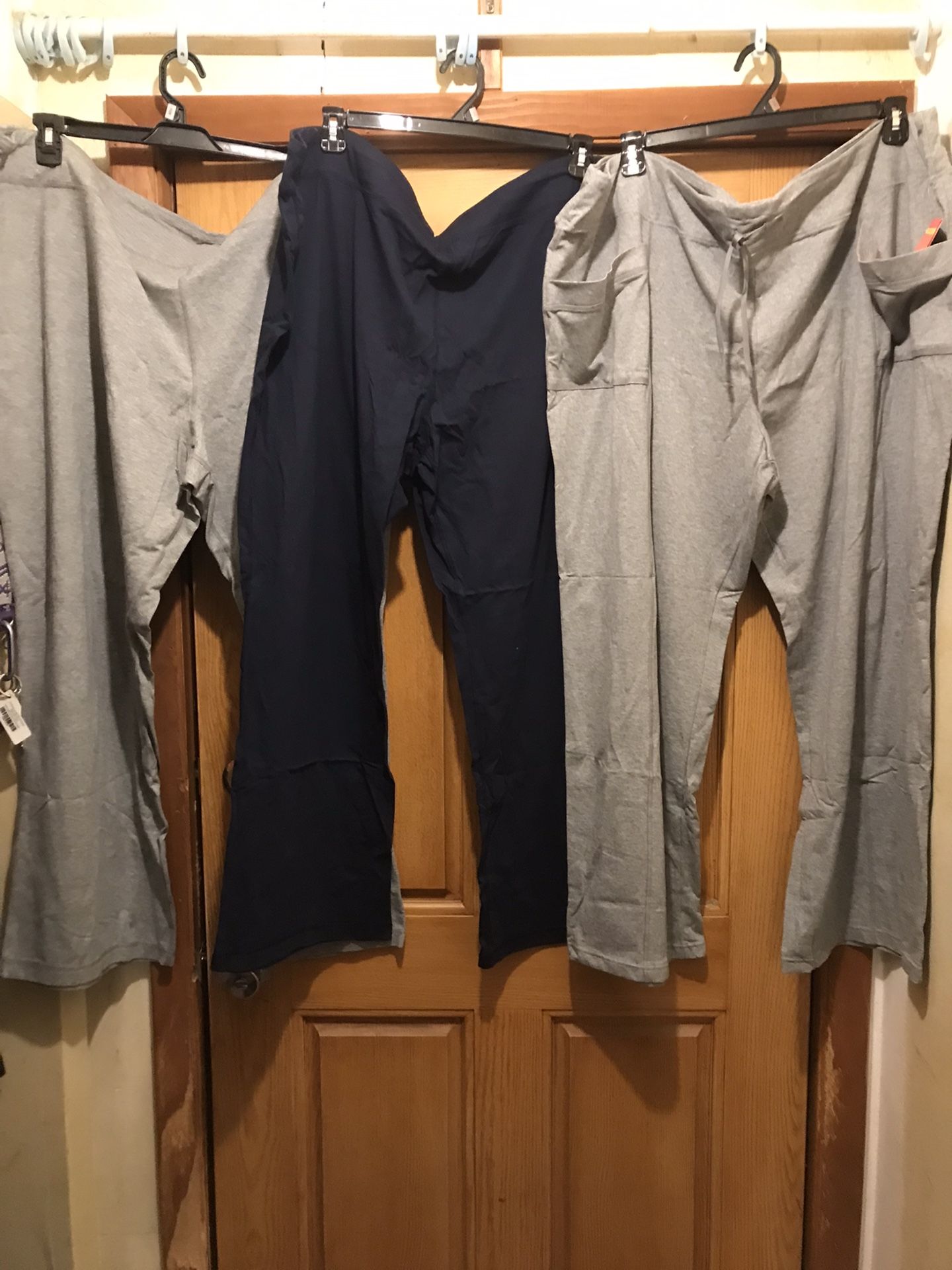 New woman’s paint’s, size 5X, comfortable, stretchy, like yoga paints, price is $16.00 each, or two for $30.00, color’s are gray and navy blue, they gray on the right has pockets, the other two do not, price firm, cash only, Alma pick