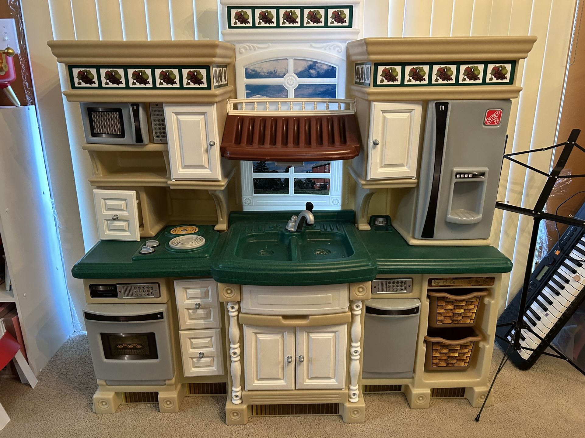 This is a full-size kitchen that makes noise and comes with a box of food and other accessories.