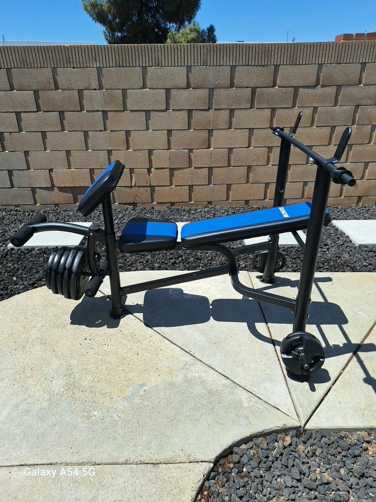 Weight bench including 50 lbs of plastic weights. Brand new never used. Cover include. No low ballers
