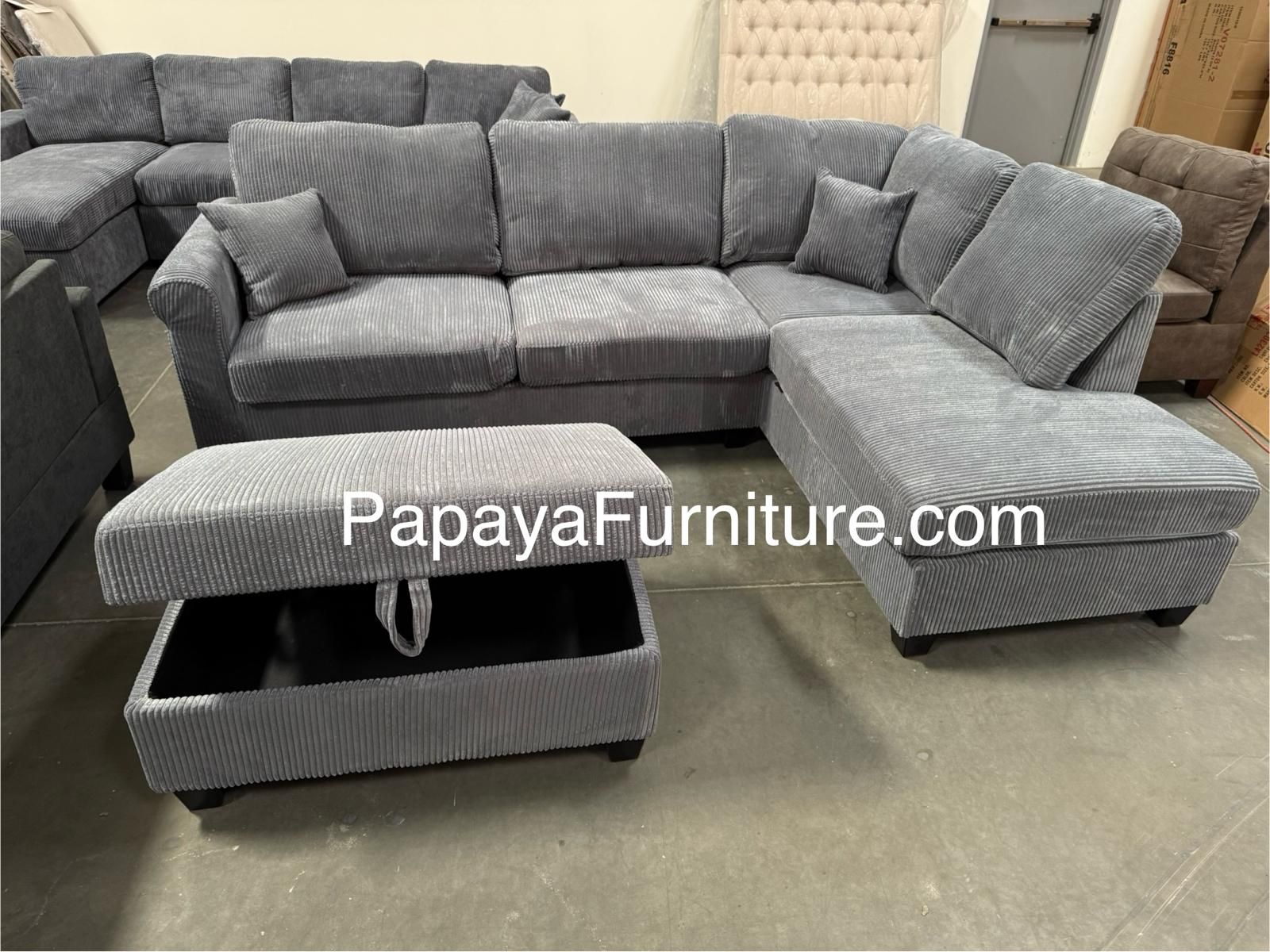 ✅ Financing available. New in box. 106" x 76" Dark Grey Corduroy Fabric Sectional Sofa and Chaise Set. FREE STORAGE Ottoman. Also available in Ivory white beige, green, black color. Visit us to see this item in person. Pick up or delivery. Skip the wait. Shop local. We deliver today*. Furniture store near me. Sofa same day delivery Los Angeles, Orange, Chino, Riverside and surrounding areas. *Terms and conditions apply. We are 20,000+ sq ft furniture warehouse. Buy with confidence!