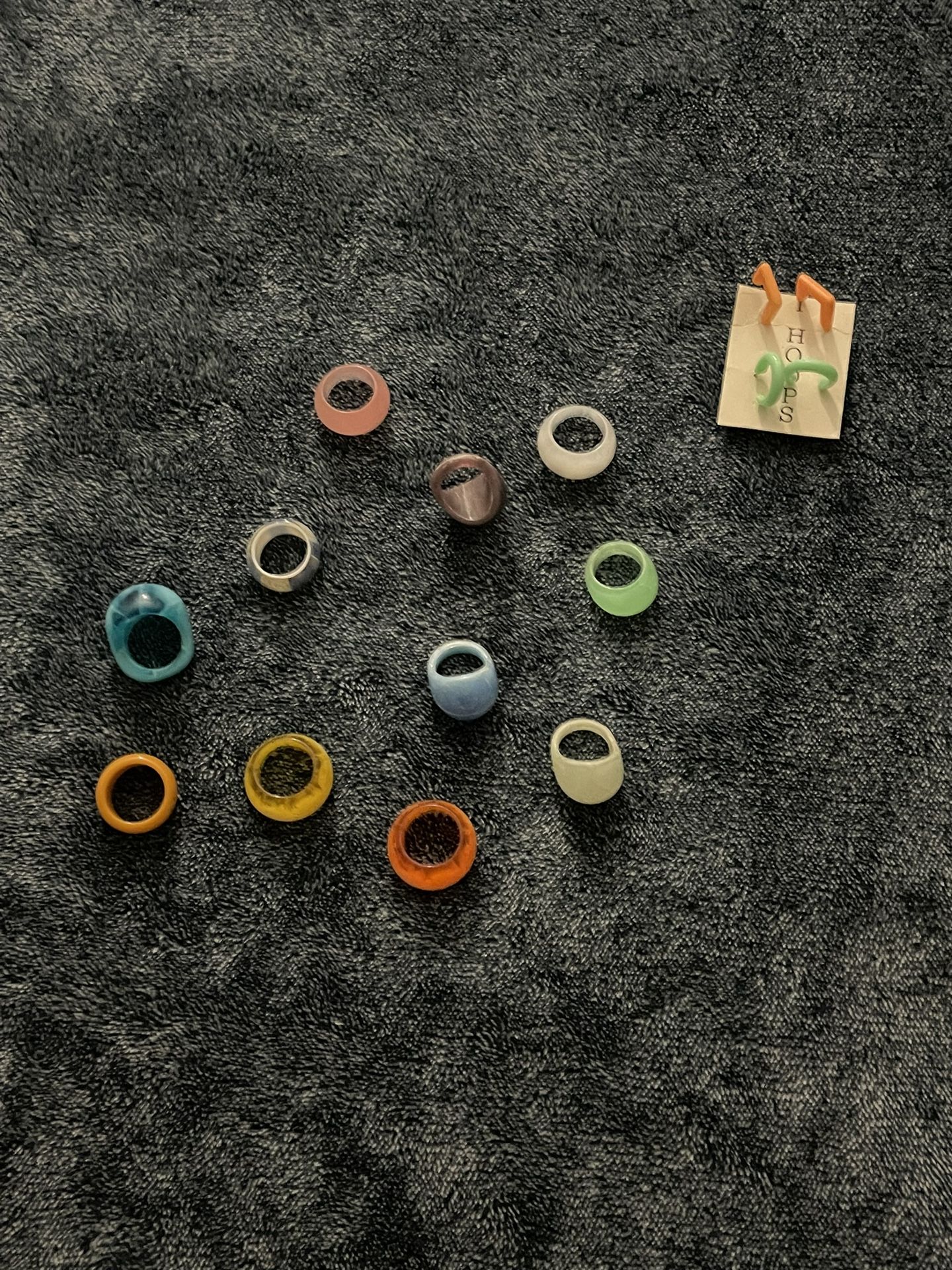 Here is a unique vintage lot of colorful acrylic rings and earrings! Add this colorful set of costume jewelry to your wardrobe for a fun way to keep things interesting.