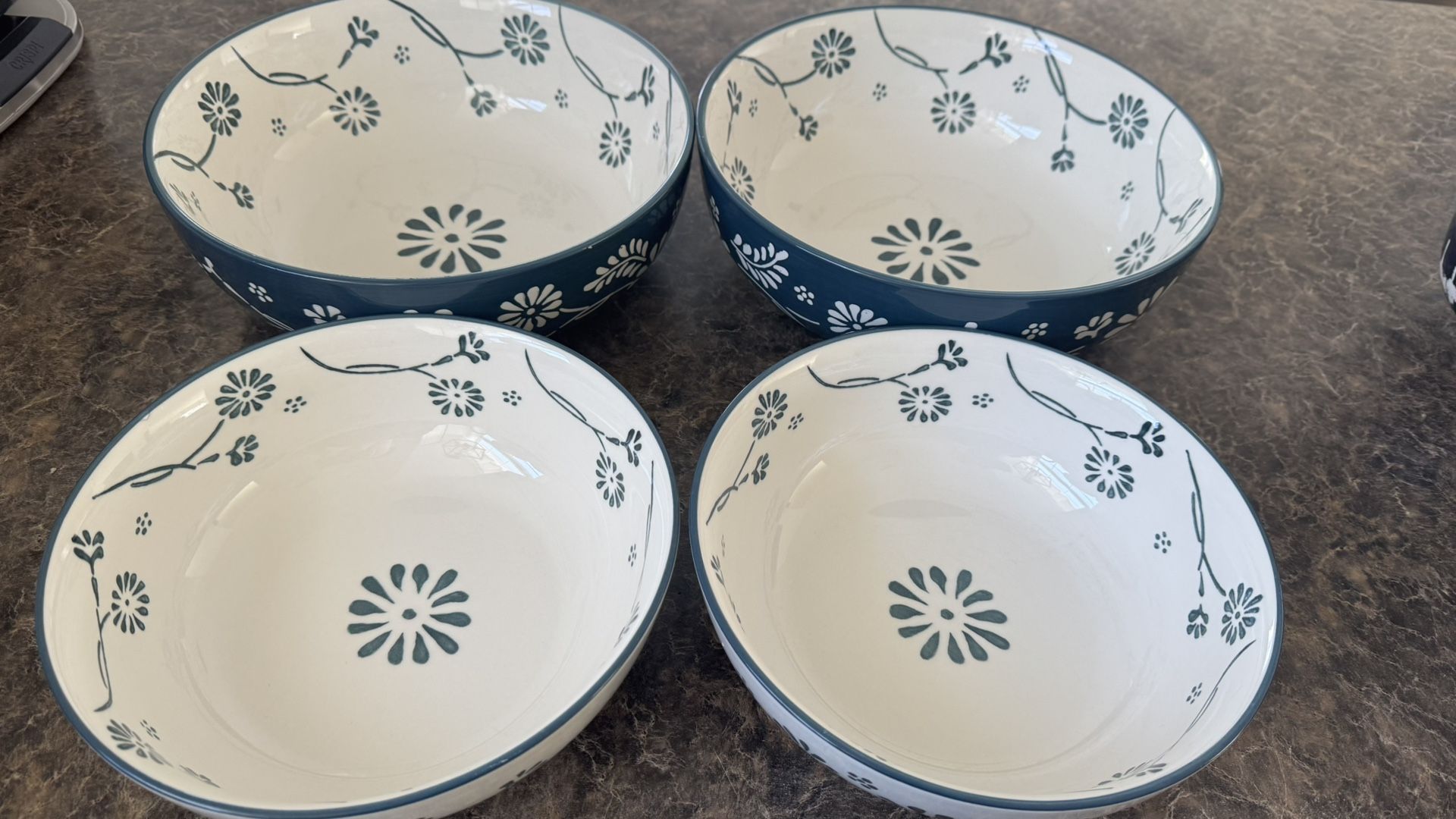 These bowls are so pretty, 2 large and 2 medium size bowls perfect for baking, salads or soups. The possibilities are endless with these bowls.