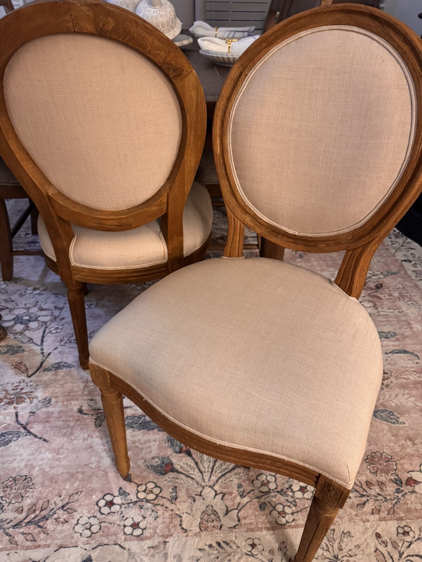 This is a set of oatmeal colored, linen upholstered chairs with very neutral wood tone. Very clean; like new. Priced as a set. Porch pick up in Keller on the Southlake border. No holds without full payment unless you are on your way to pick up.