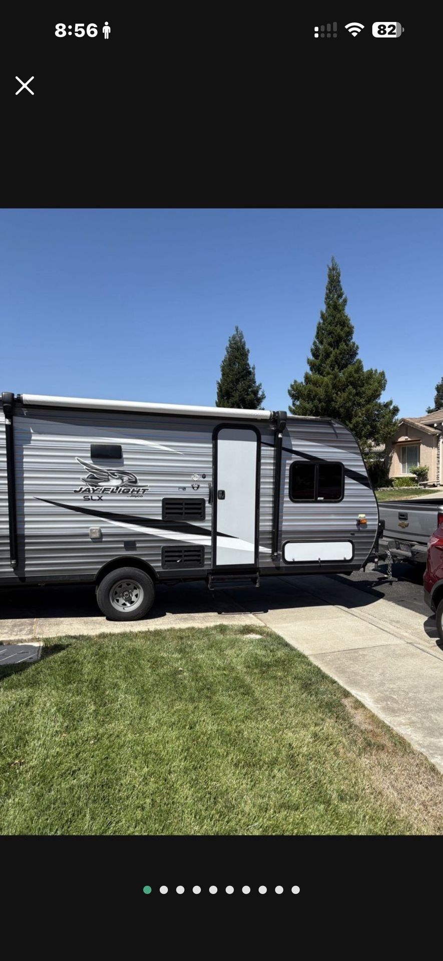Excellent Condition / Clean 2020 Jayco Jay Flight SLX 184BS • Compact Size: At 21 feet long, 7 feet 1 inch wide, and 9 feet tall (exterior) with a 6-foot 1-inch interior height, this model is relatively small and easy to tow, even with lighter-duty vehicles. The manufacturer notes that it's designed to be towed off-road, on gravel and sand as well as pavement. • Sleeping Capacity: It can comfortably sleep up to 5 people with a queen bed, two 300 lb rated bunk beds, and a convertible dinette. • Slide-Out Dinette: The dinette expands for more living space, says Bish's RV. When the slide is closed, there's still full access to the bunks, bathroom, and kitchen. • Kitchen: It comes equipped with a 12-volt refrigerator, microwave, 2-burner stovetop, and sink. • Bathroom: The bathroom features a tub/shower combination with surround paneling, a skylight, and adequate space around the toilet. • Bunks: The bunk beds are sturdy, rated to hold up to 300 lbs each. • Air Conditioning & Solar Prep: The RV features a side-mount 8,000 BTU air conditioner and is prepped for solar and a solar charge controller. • Other Features: The trailer boasts tinted windows, a 10-foot electric awning with LED lights, exterior speakers, and a gas grill hookup for outdoor cooking. It also features a Magnum Truss™ Roof System that is 4,500 pounds rated and has 3/8 inch plywood screwed down to 2x2 real wor studs with oversized nail plates. ® Specs and Capacities • Dry Weight: 3,240 - 3,350 lbs (depending on configuration). (contact info removed)