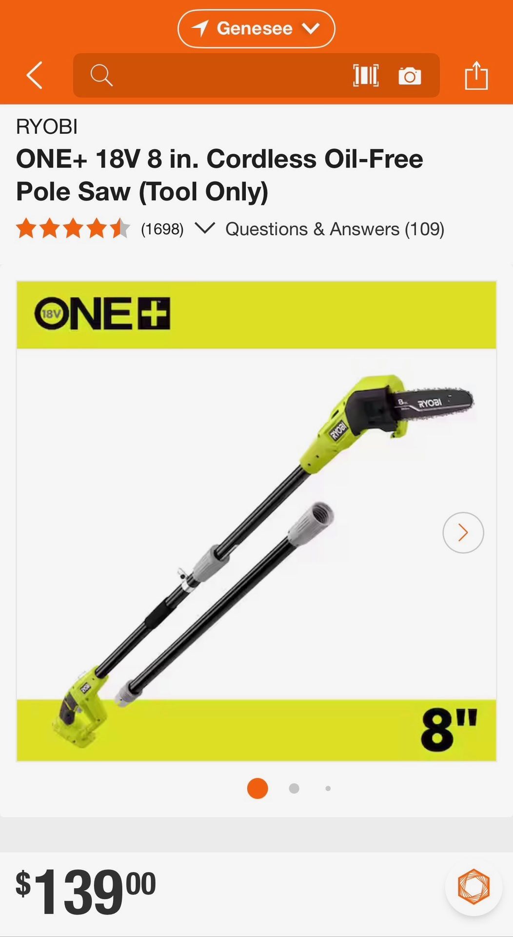 Brand new Ryobi ONE+ 18V 8 inch cordless pole saw. Tool only, no battery or charger included. Great for trimming branches. Used once and works good.
