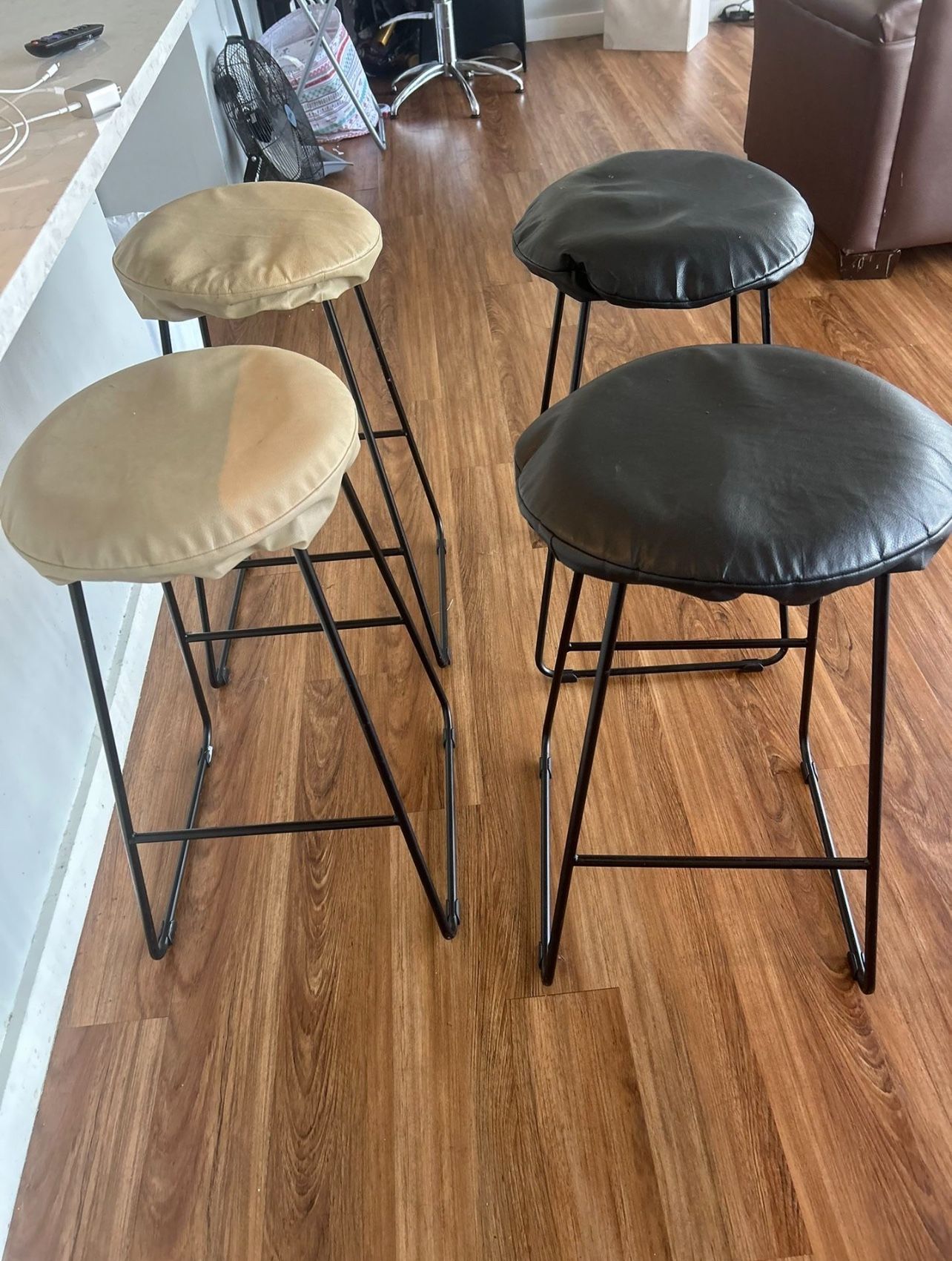 Metal bar stools for sale. Lot of 4. Comes w/ leather seat covers. Used but definitely not abused. Only asking for $50 for all 4 or best offer