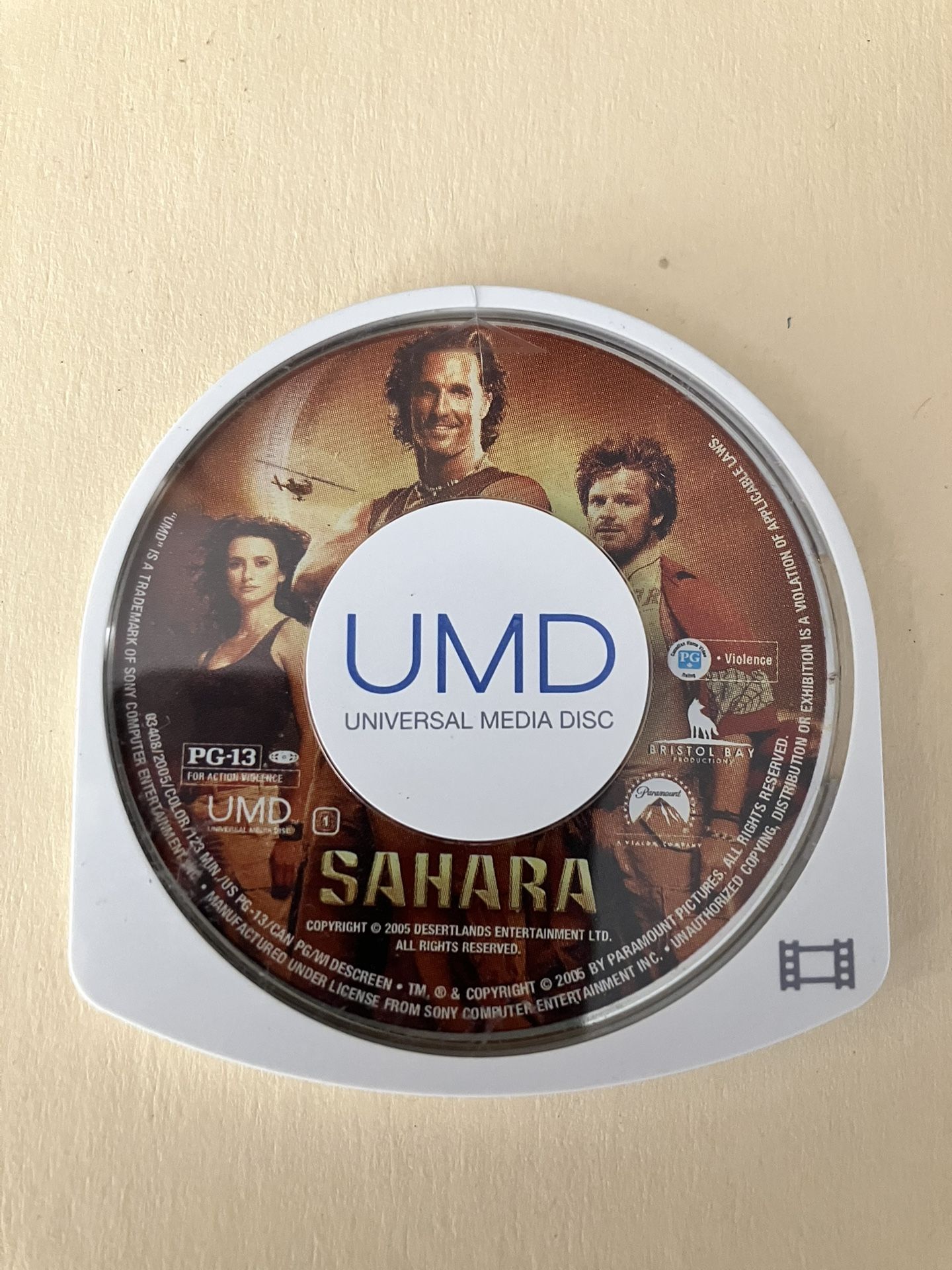 The Sony PSP UMD Disc "Sahara" is an action-packed adventure movie. Directed by Breck Eisner, the film features the compelling storyline and characters portrayed by Penélope Cruz and Matthew McConaughey. With a mix of action and adventure elements, this PlayStation Portable game offers a thrilling experience for fans of the genre. Listing is only for the UMD disk, does not include PSP  Bring your PSP to try it out