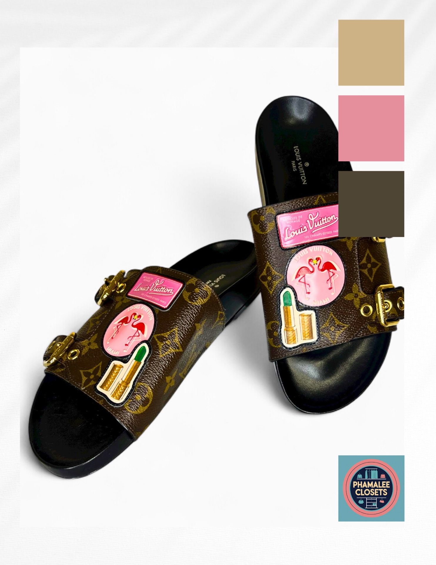 Louis Vuitton slide / mule with monogram canvas + decorative patches. Retail estimate: US$800