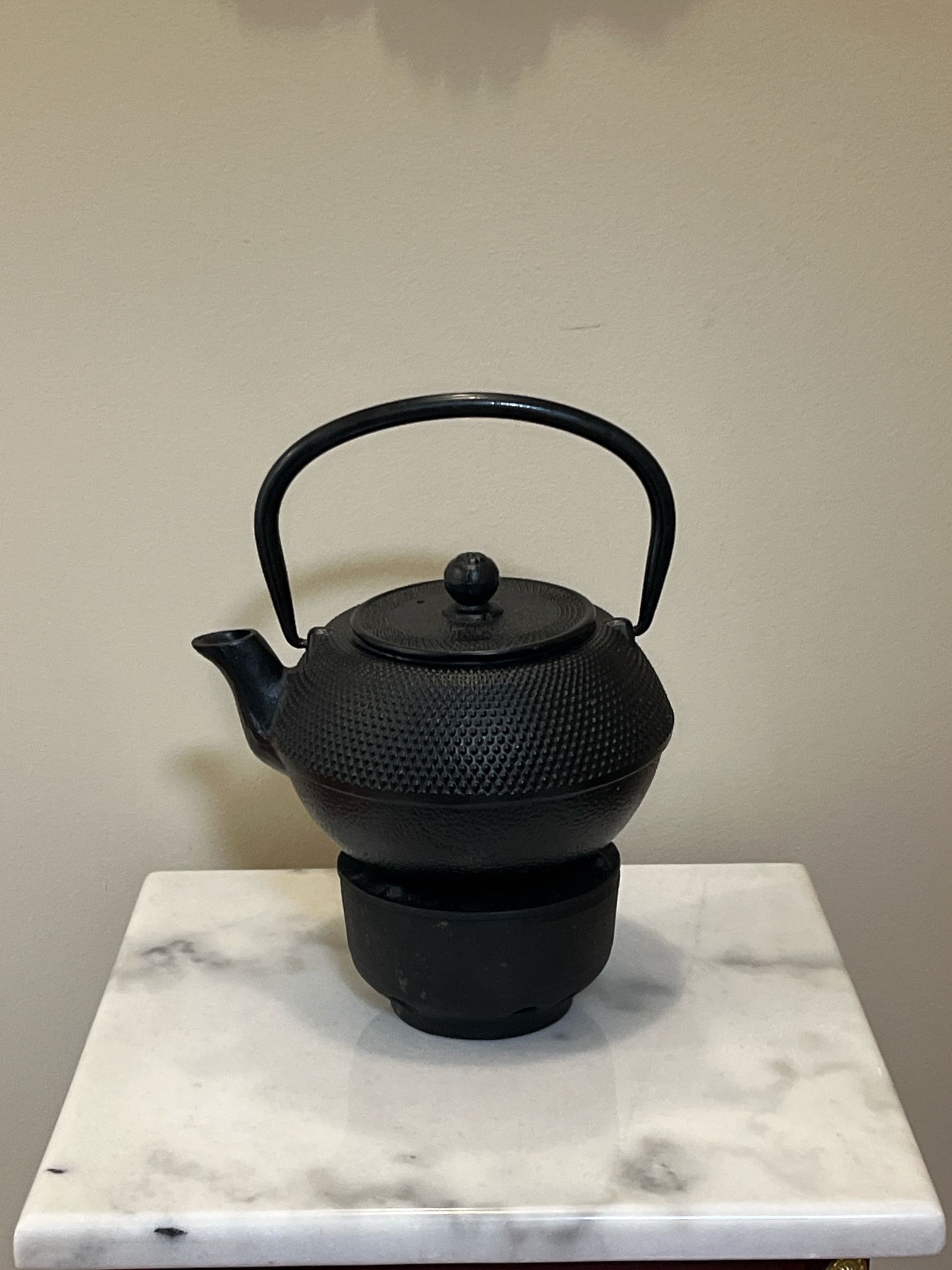 Cast Iron Hobnail Teapot With Warming Stand; Comes with ceramic lined pot, lid, strainer, and warming stand; See pictures for dimensions; Excellent Condition; $35 or reasonable offer; Payment by Cash, Zelle, Cash-App, or Venmo.