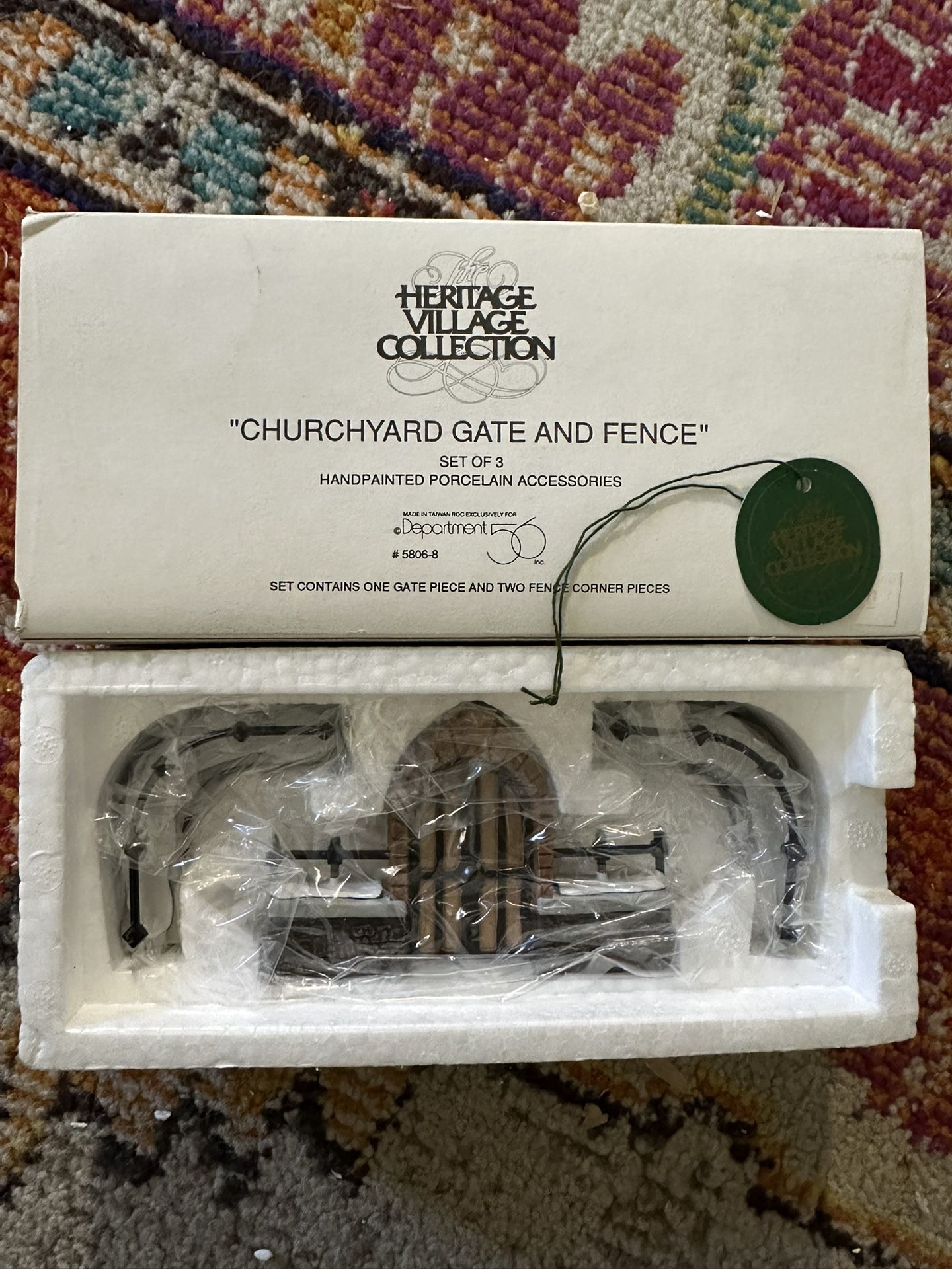 Dept. 56 Heritage Village Collection – Village Accessories “CHURCHYARD GATE AND FENCE” – Set of 3 – Retired Hand-painted porcelain. Includes original box, Styrofoam insert, and hanging Dept. 56 medallion. Excellent condition. This three-piece accessory set features a detailed arched stone gate with wood-paneled doors and two matching corner fence sections. Designed to pair seamlessly with Dickens’ Village and Heritage Village buildings, it adds architectural depth, realism, and grounded visual framing to winter scenes. The sculpted stone texture, ironwork accents, and crisp hand-painted detailing make it a versatile backdrop or focal transition piece within a village layout. All structural and paint details are intact with no chips, cracks, breaks, or repairs. Clean, collector-kept condition. Price: $18 OBO This retired Village accessory (introduced early 1990s and long out of production) remains a sought-after finishing detail for collectors looking to complete period-accurate displays.