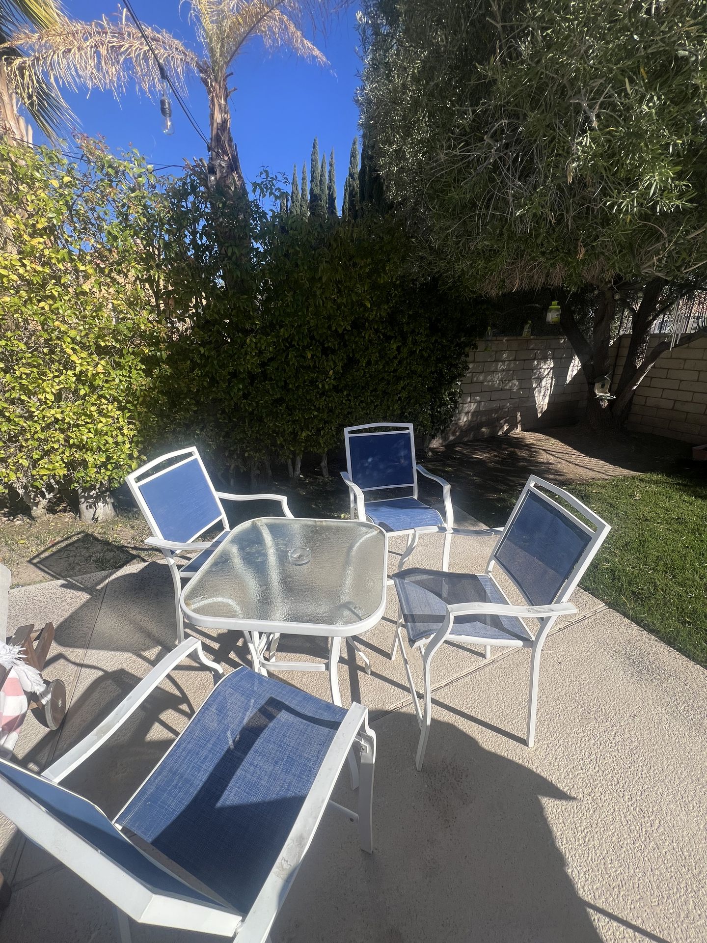 High sitting square glass table with sturdy white metal frame and 4 matching chairs. Modern, clean look. Tempered glass top. Chairs are comfortable and lightweight but solid. Great for backyard, patio, or pool area. Good condition. Message if interested.