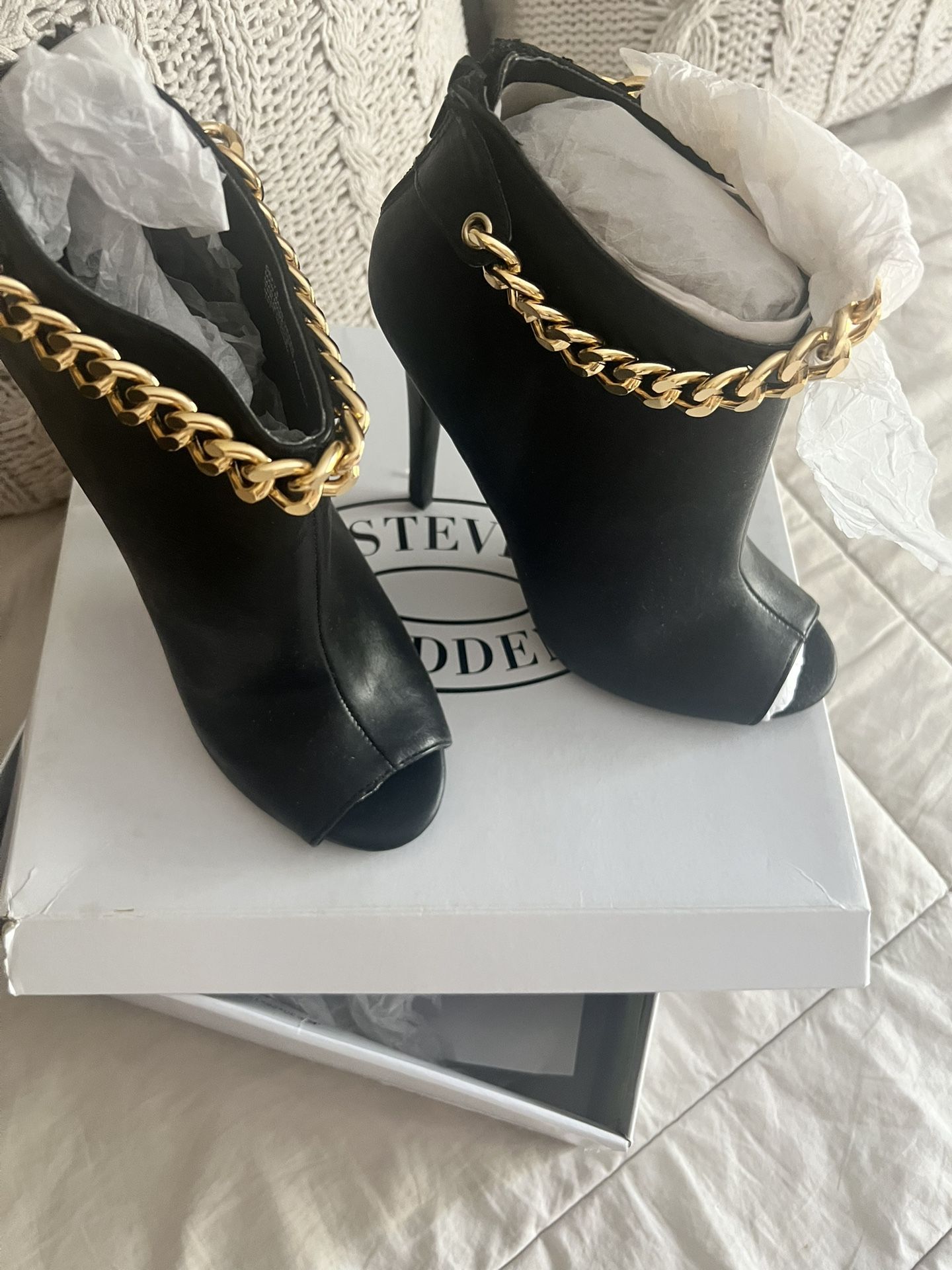 Steve Madden beautiful Shoes. Elevate your style with these chic Steve Madden ankle boots. Featuring a sleek black design and a striking gold chain detail, these peep toe boots are perfect for any occasion. • New in box • Size 8 • Defy Black Color • First $220.00 will take it • Pick up in Lancaster, CA or I can send Nationwide by mail • cross-posted Have a lovely Day!!!
