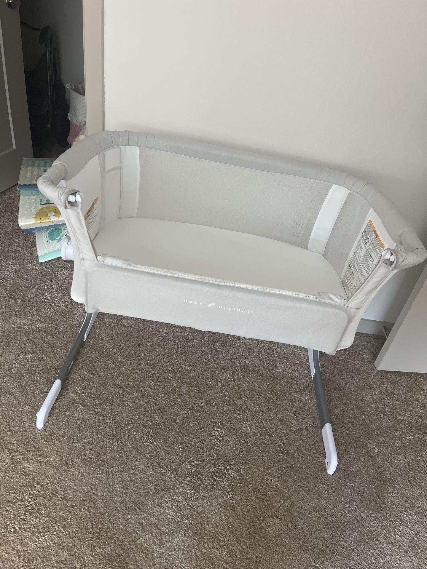 Selling a Baby Delight bedside bassinet in great used condition. Neutral light gray color, perfect for boys or girls. It has breathable mesh sides for visibility and airflow, and a firm, safe mattress pad included. ✔️ Clean and well-kept ✔️ Sturdy and lightweight ✔️ Easy to move from room to room ✔️ Modern, minimal look ✔️ Smoke-free, pet-free home Normal wear from use, but overall still in very good condition and fully functional. Great for newborn stage, naps, and keeping baby close overnight.