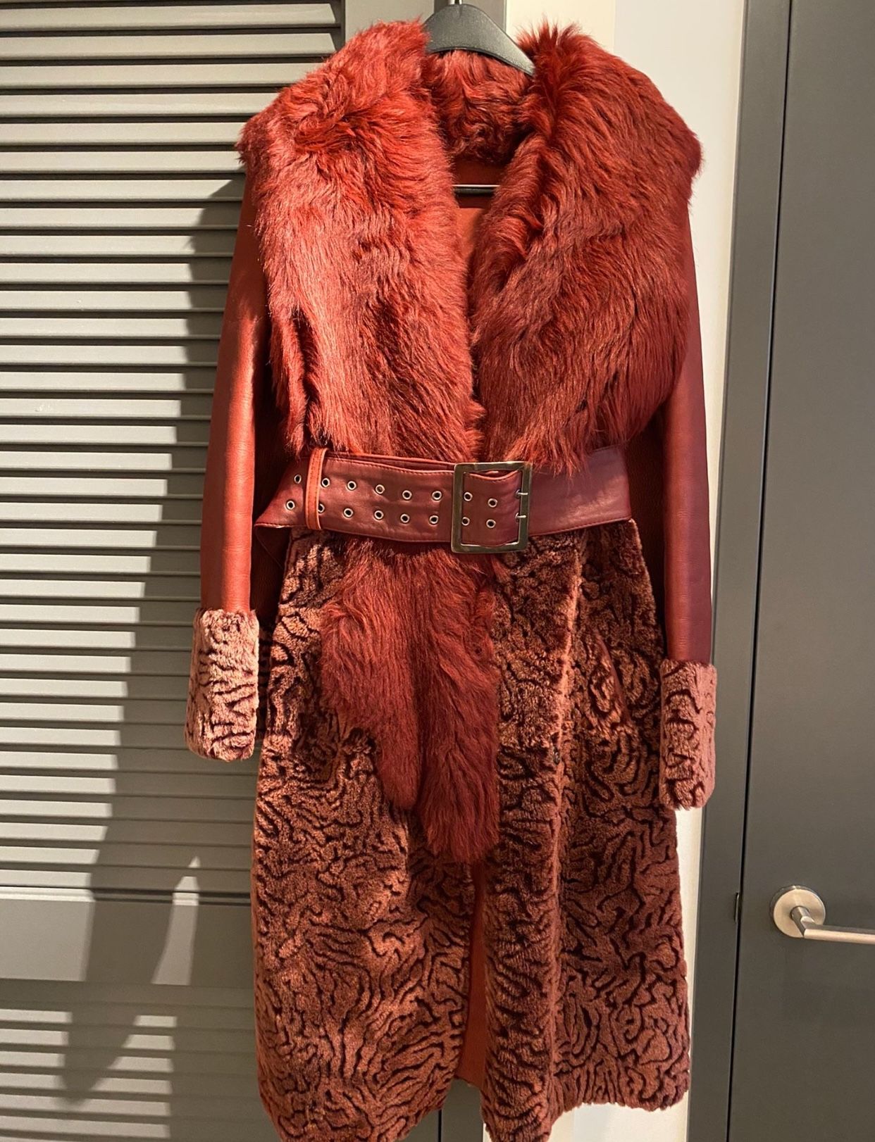 Natural women's sheepskin coat of burgundy color, made and purchased in Turkey