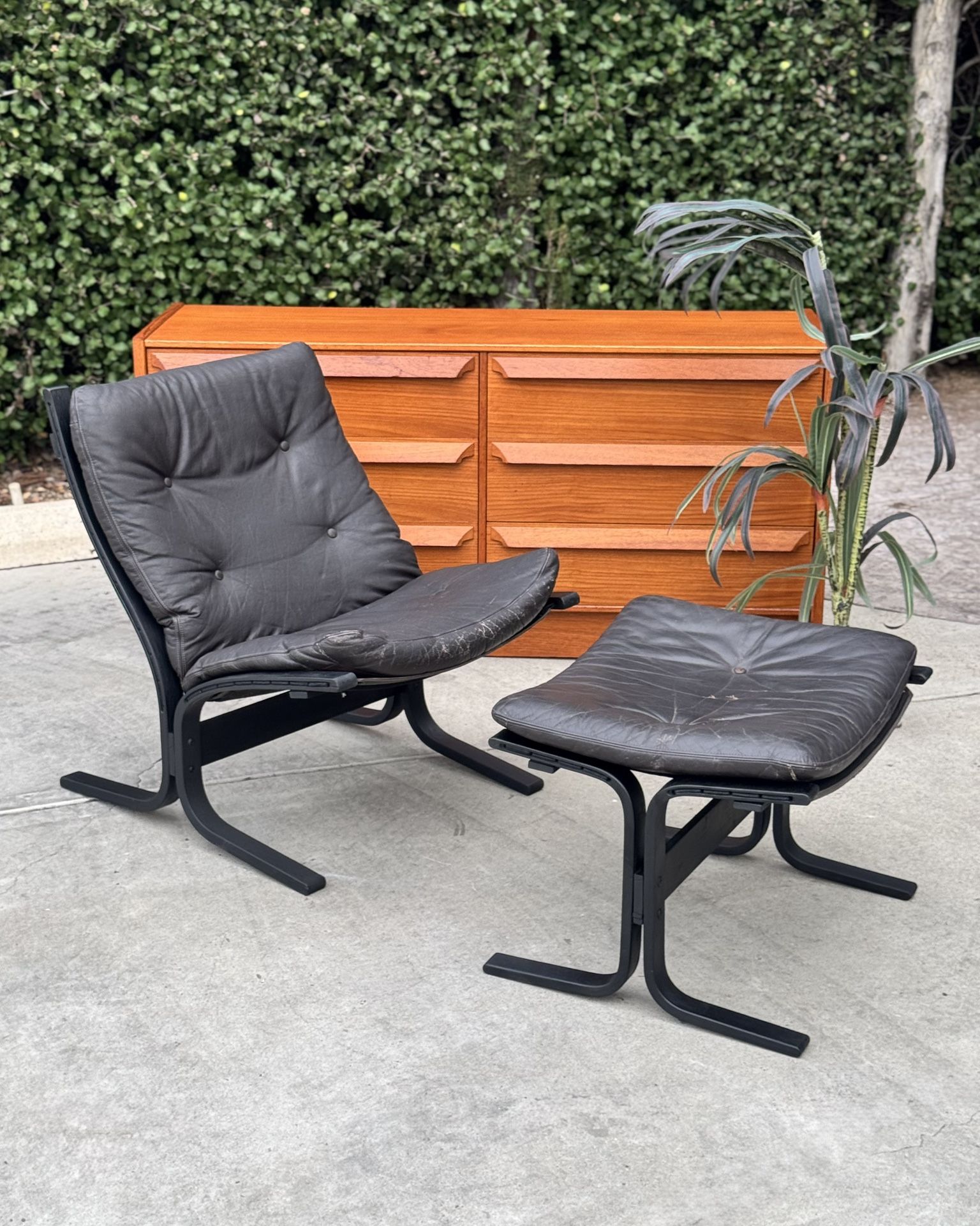Iconic mid century modern Siesta lounge chair and matching ottoman, designed by Ingmar Relling for Westnofa of Norway, showcase timeless Scandinavian craftsmanship. The low back profile, black tufted leather upholstery, and sculptural bentwood frame create a perfect balance of comfort and elegance. A true vintage modern classic, this two-piece set adds refined warmth and character to any living space. In good vintage condition with signs of use/wear on the leather. Delivery available for extra fee or pick up is in North Park. (Chair measures: 24.5" Wide x 32" Deep x 17.5" Seat Height x 32" Back Height) (Ottoman measures: 25" Wide x 21" Deep x 18" Height) Cash only. Price is firm.