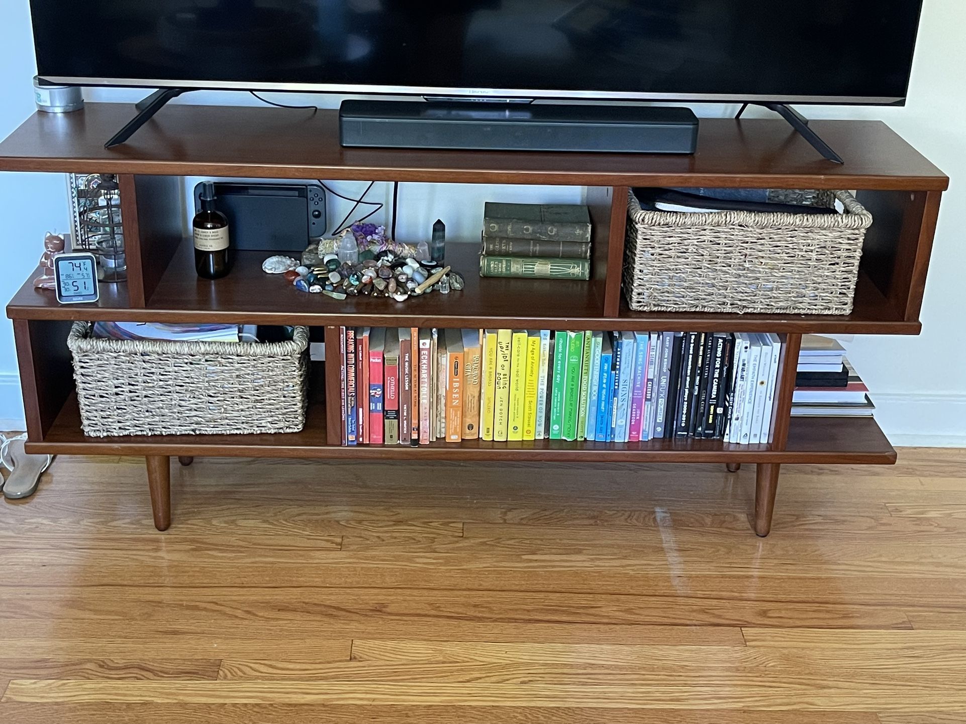 Only a few months old, in good condition! Has a few minor marks. Description Featuring four roomy compartments, our bestselling mid-century-inspired Ashlyn bookcase offers ample storage space for books, framed photos and keepsakes. A rich medium-walnut stain highlights the wood construction of this asymmetrical shelf that doubles as a console table. Specifications Crafted of poplar wood and walnut veneer with medium walnut finish 4 compartments total Available in additional sizes, sold separately Wipe with a dry cloth World Market exclusive Dimensions Overall: 60"W x 14"D x 28"H, 83.8 lbs. Leg height: 8.98"H Large compartments: 29.92"W x 14"D x 8.98"H each Small compartments: 19.06"W x 14"D x 8.98"H each