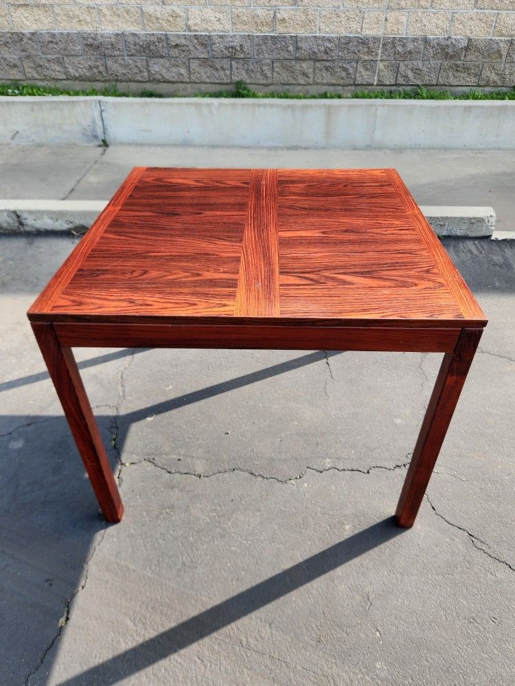 Hi! Here's a table for Vejle Stole- og Møbelfabrik made in Denmark. Solid sturdy rosewood square dining table with missing leafs perfect for compact space. This piece is vintage and ready for your space! Send me a message if interested thanks! W35.5×D35.5×H29
