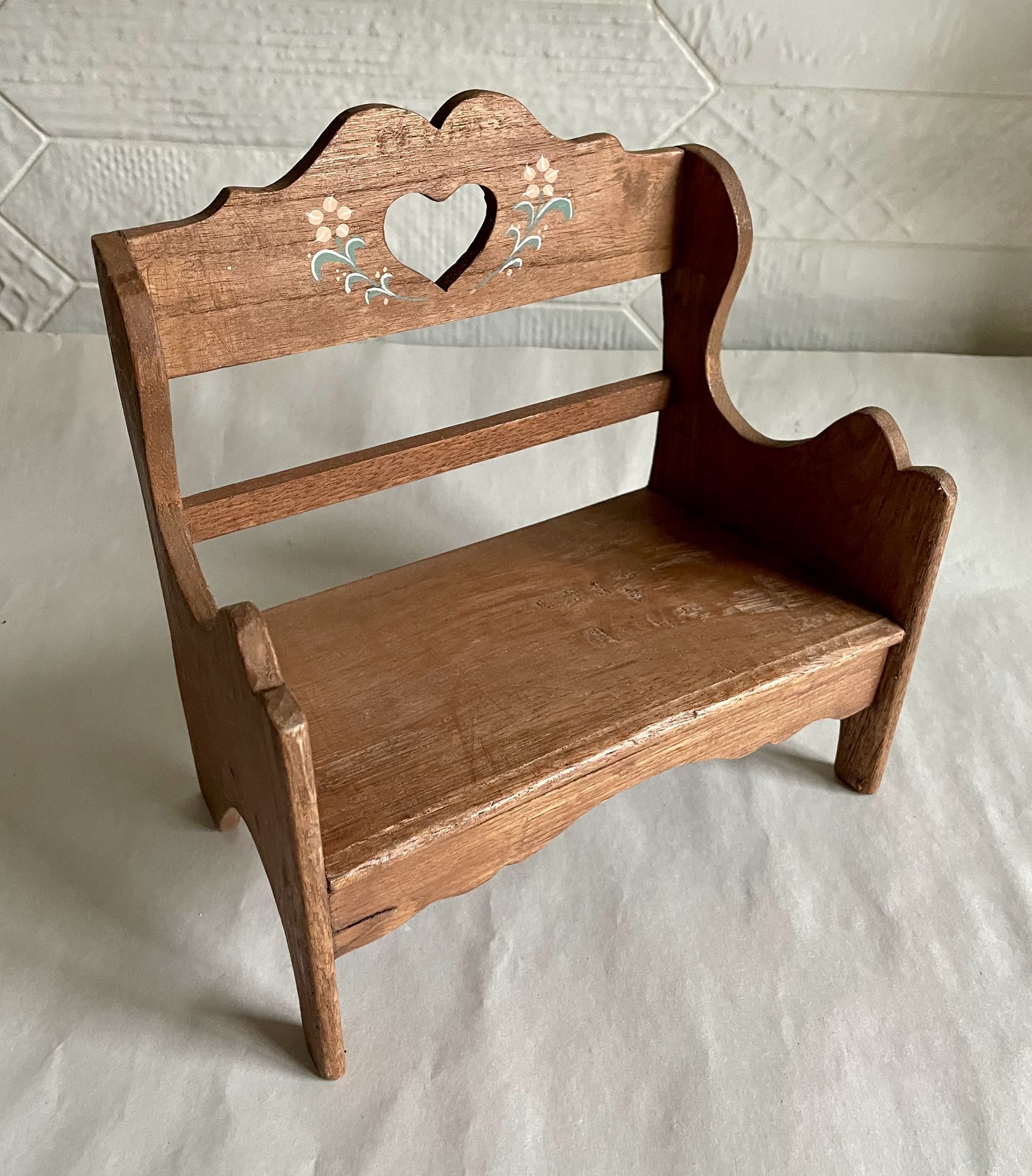 A cute vintage wooden bench with a heart cut-out and floral design. Item is in good condition and has no notable flaws or imperfections. Measures 8.5 inches tall, 8 inches wide, and 5 inches in depth.
