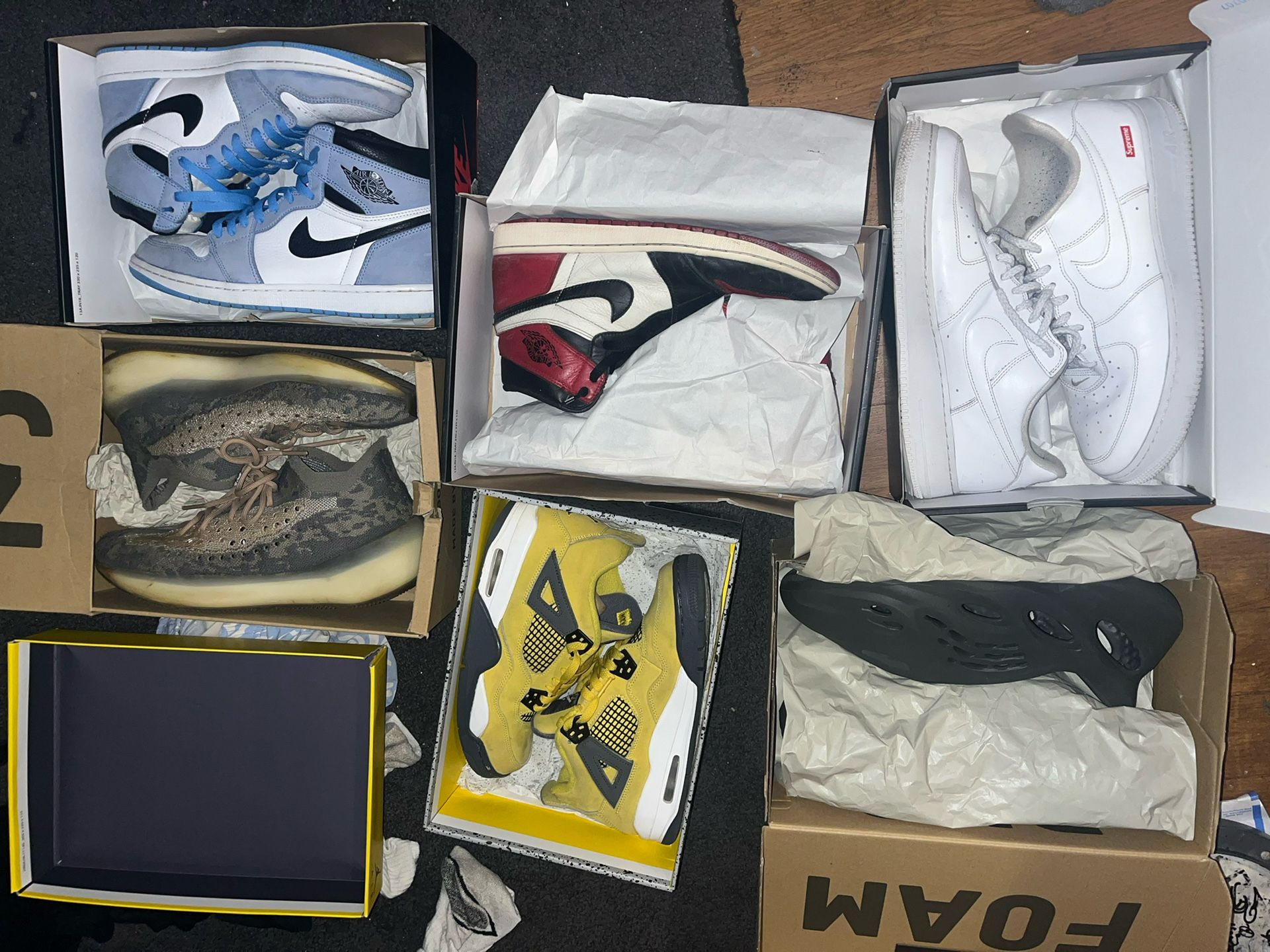 jordan 1 high og bred 11 (2016 pair)size11ogal jordan 1 university blue og all size 10.5 jordan 4 lightning size 7 og all yeezy foam runner size 12 og all almost ds supreme airforce 1 size 11 og box yeezy 380 size 12 rep yeezy box willing to do cash or trades for all pairs don’t be scared to offer worst i can say is no looking for size 11univrristy blues size swap i can add depending supreme yeezy nike