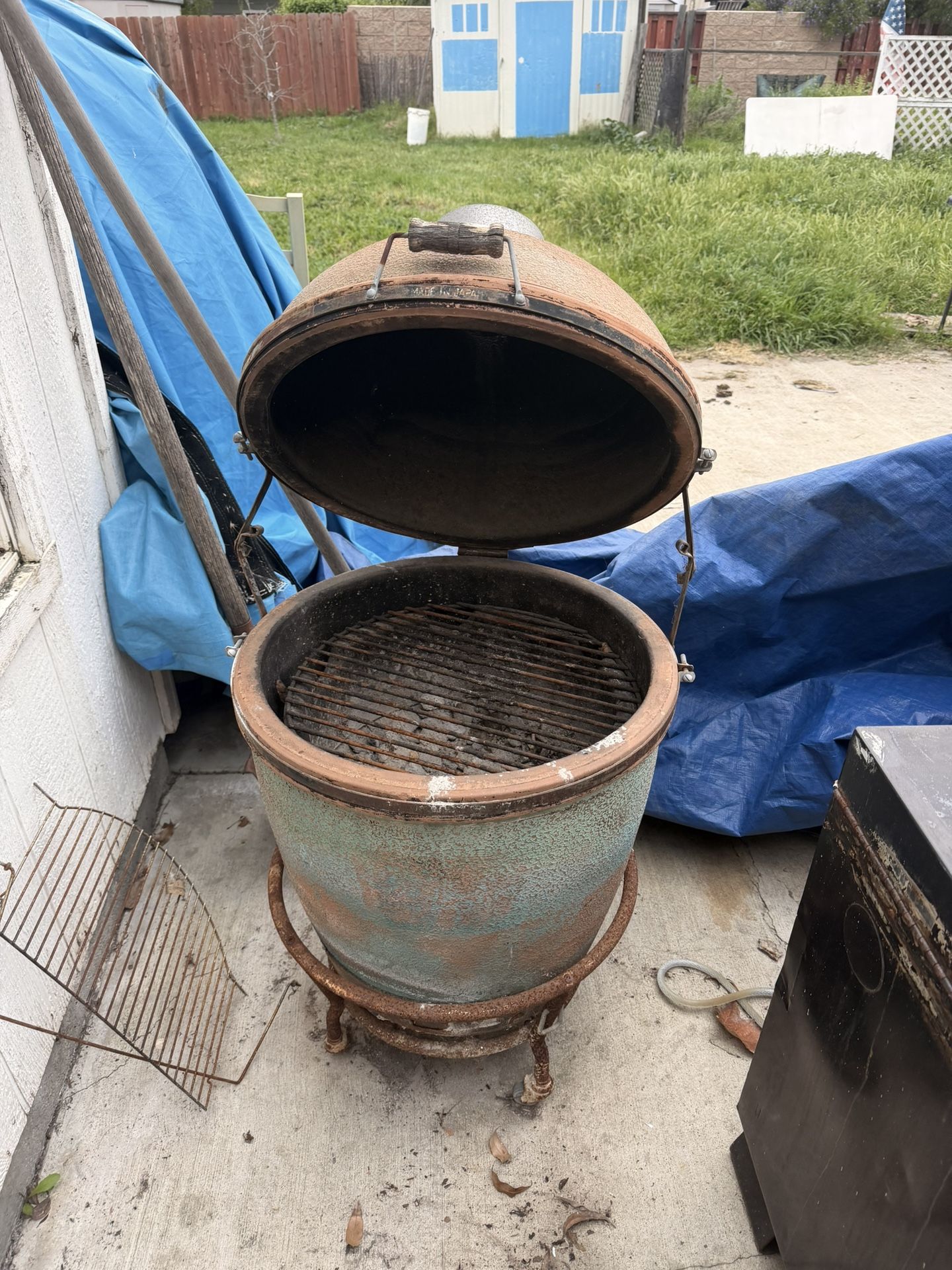 Vintage ceramic kamado-style charcoal grill. Heavy ceramic body with cast iron top vent. Older piece with lots of character — great for restoration, outdoor cooking, or collectors. Big green egg style. This is from the 1960s or 1970s I believe. Condition: • Structurally solid ceramic • Surface rust on metal parts from age • One hinge/band is slightly bent, so lid is a bit hard to close • Sold as-is These older kamado grills are getting harder to find. Heavy item — local pickup only. Price: $200 OBO