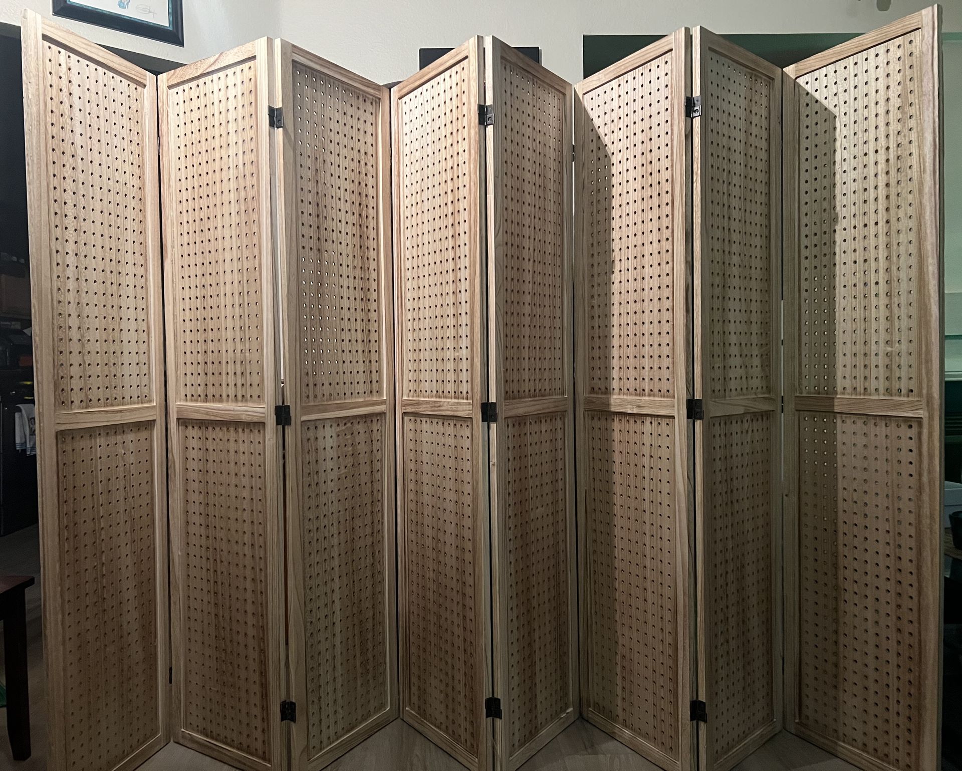 8 PANEL NATURAL WOOD PEGBOARD DISPLAY ROOM DIVIDER - NEW 5.6’ HIGH 128” ACROSS NEVERPAYRETAIL OF $219 BUY LOCAL FROM US FOR $180 NS49