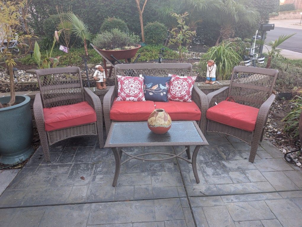 Beautiful outdoor set in great condition. Perfect to relax outdoors with family and friends. Comes from a pet free smoke free home. Includes pillows and table top decoration.