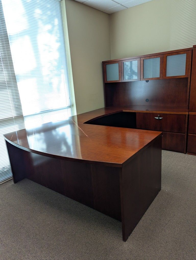 Bow front u shaped executive desk with credenza/ credenza hutch / 2 drawer file cabinet Plus Storage 2 shelved/wardrobe cabinet Plus 2 more 2 drawer file cabinets (total of 3 in the set) Like New!
