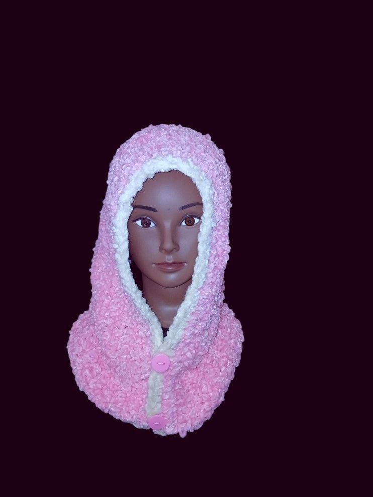 Handmade crocheted womens pink soft winter hood. Hood is approximately(folded) 19 inches long and 13 inches wide which makes for a 26 inch circumference. This hood is extremely soft and warm will keep your head very secure from the brittle cold or send to someone you know in a very cold state. Ready to be picked up.