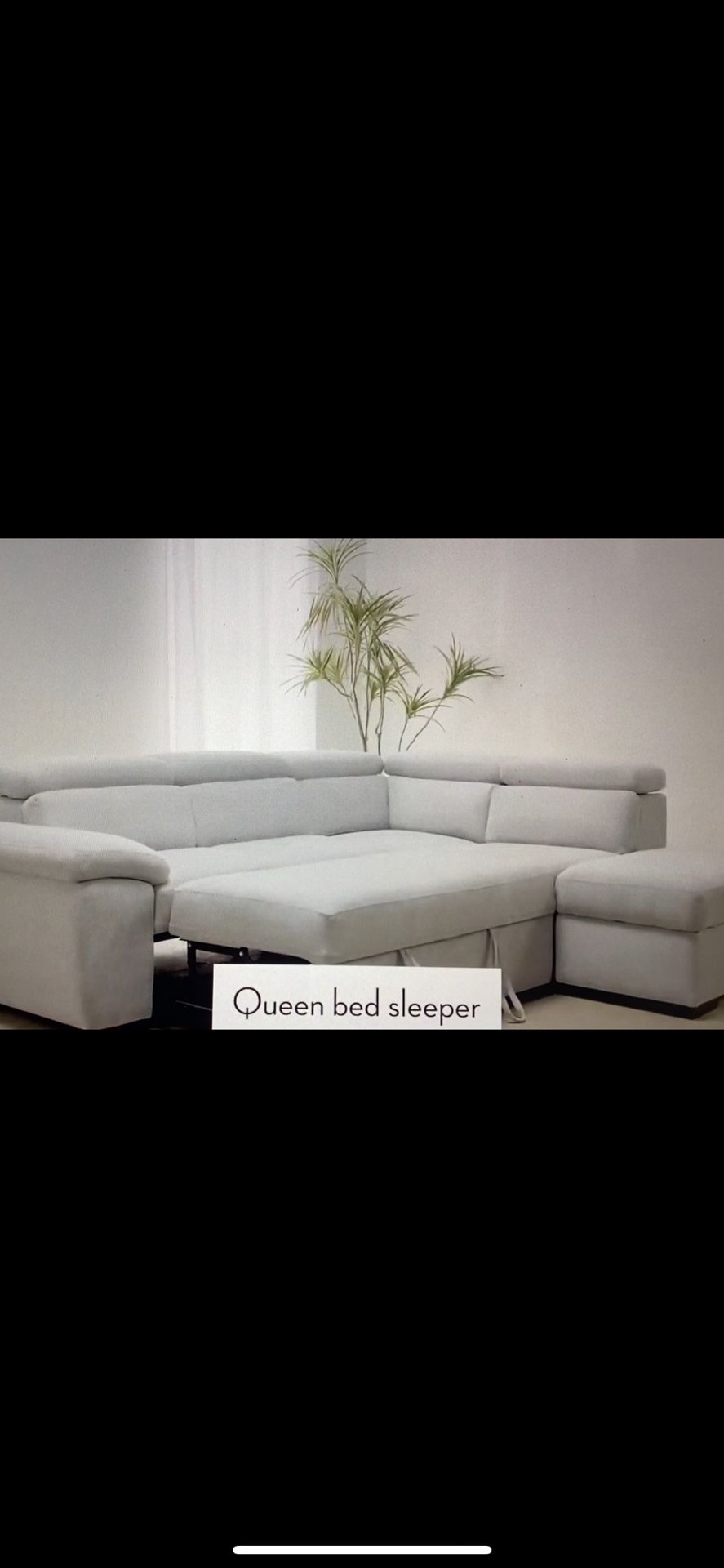 1 year minimal use in a spare room Originally 2k+ from living spaces Key Features • Queen Bed Sleeper – Pulls out smoothly and easily (see photos) • Chaise Storage Compartment – Fits blankets, pillows, etc. • Adjustable Headrests • Soft, modern fabric in light gray • Left or right configuration depending on your room • Sturdy + comfy with supportive cushions • Pet-free, smoke-free home Only selling because I’m changing the room Dimensions • Length: ~9 ft • Chaise depth: ~5.5 ft • Ottoman: ~2.5 ft x 2.5 ft (Fits perfectly along a wall or floating in a room.) Condition ✔️ Cushions still firm and supportive ✔️ No rips or tears ✔️ Fabric looks new ✔️ Recliner/slide-out bed section works perfectly Pickup Info • Pickup only • I can help load it if needed