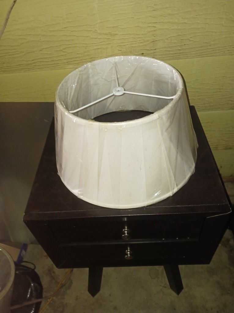 White, fabric, cone-shaped lamp shade. Brand new, still in packaging. Has never been used. The diameter of the top circle is 10 inches. The diameter of the base circle is 14 inches. Lamp shade in 8 inches in height.