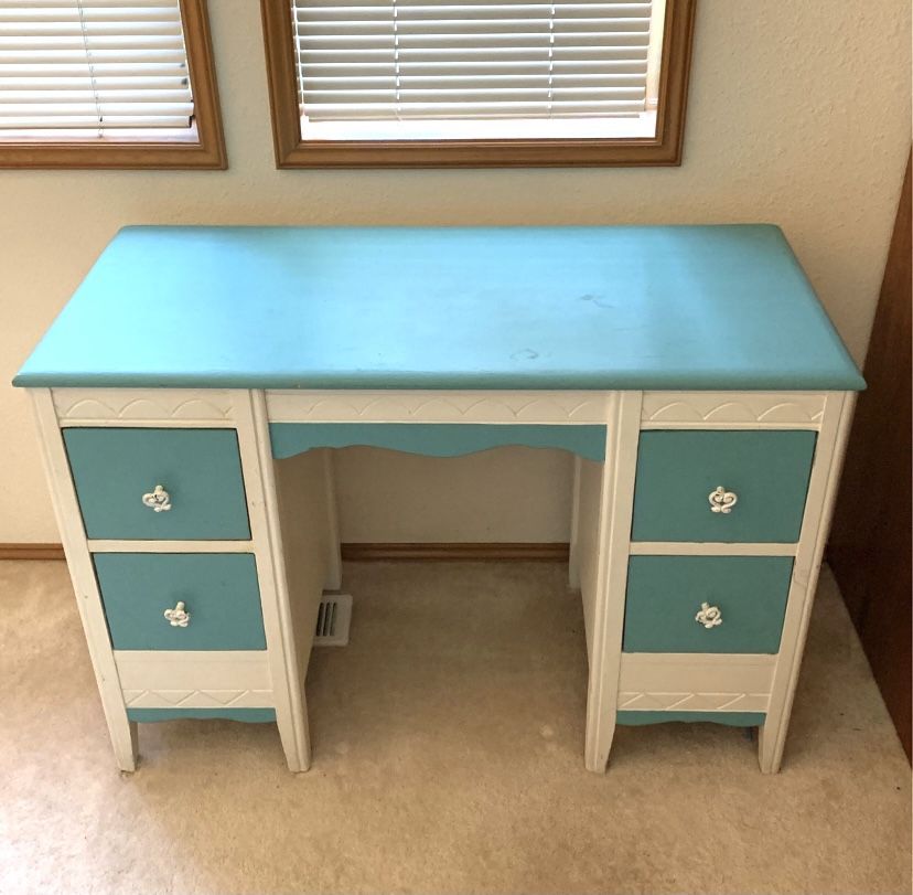 I have a beautiful white and blue desk. It has 4 drawers for storage. I got it custom painted and chose the handles for it. Measurements- length: 42, width: 19.5, height: 28.75 Check out my profile for the matching dresser and nightstand :) If you have any questions, let me know!