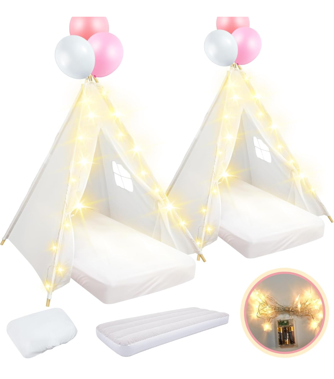 Two pack kids teepee tent with mattress, fitted sheet, light string, washable natural cotton toddler play tents for girls, boys, indoor/ outdoor, sleepover, slumber, birthday party (white)