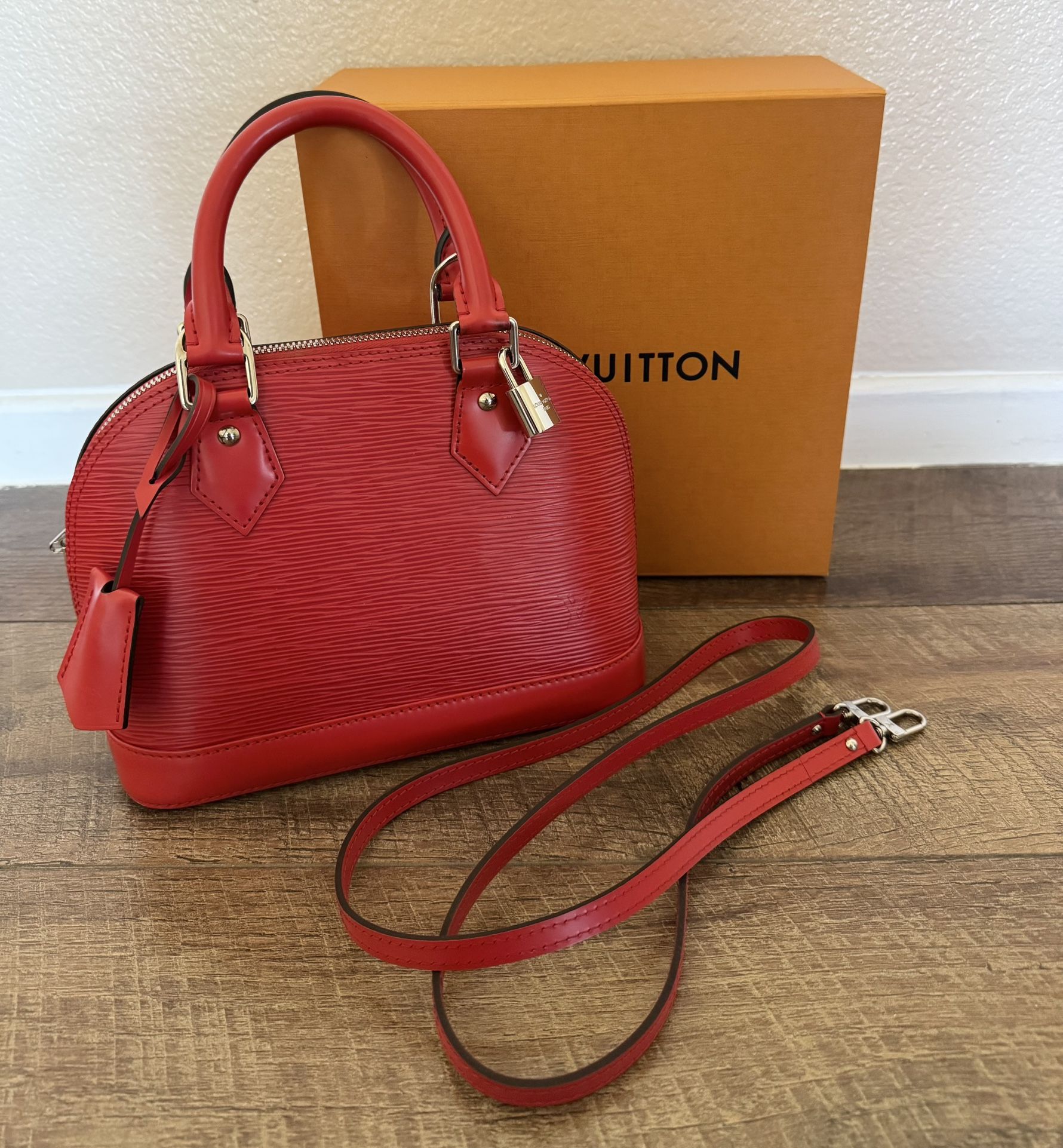 Epi Leather Alma BB. Used but in great condition. Interior has some normal everyday wear and some black mark stains on top of inside pocket and bottom of bag. (See pics) Red Suede material on inside interior. Comes with box, dust bag, shoulder strap, ribbon, lock, keys, and receipt. Red beautiful color. Made in France. Faint scratches on bottom of bag ( see pics) Some black marks on bottom of handles. Faint scratches on silver hardware. 9.3 x 6.9 x 4.5 inches (Length x Height x Width) • Black • Epi grained cowhide leather • Smooth cowhide-leather trim • Microfiber lining • Silver-color hardware • Double zip closure • Padlock • Key bell • Inside flat pocket • 4 protective metal bottom studs • Fits: 6.7-inches smartphone, earphones, lipstick, tissues, keys, sunglasses • Weight: 0.5 kg • Strap: Removable, adjustable • Strap drop:19.7 inches • Strap drop max:24.4 inches • Handle:Double