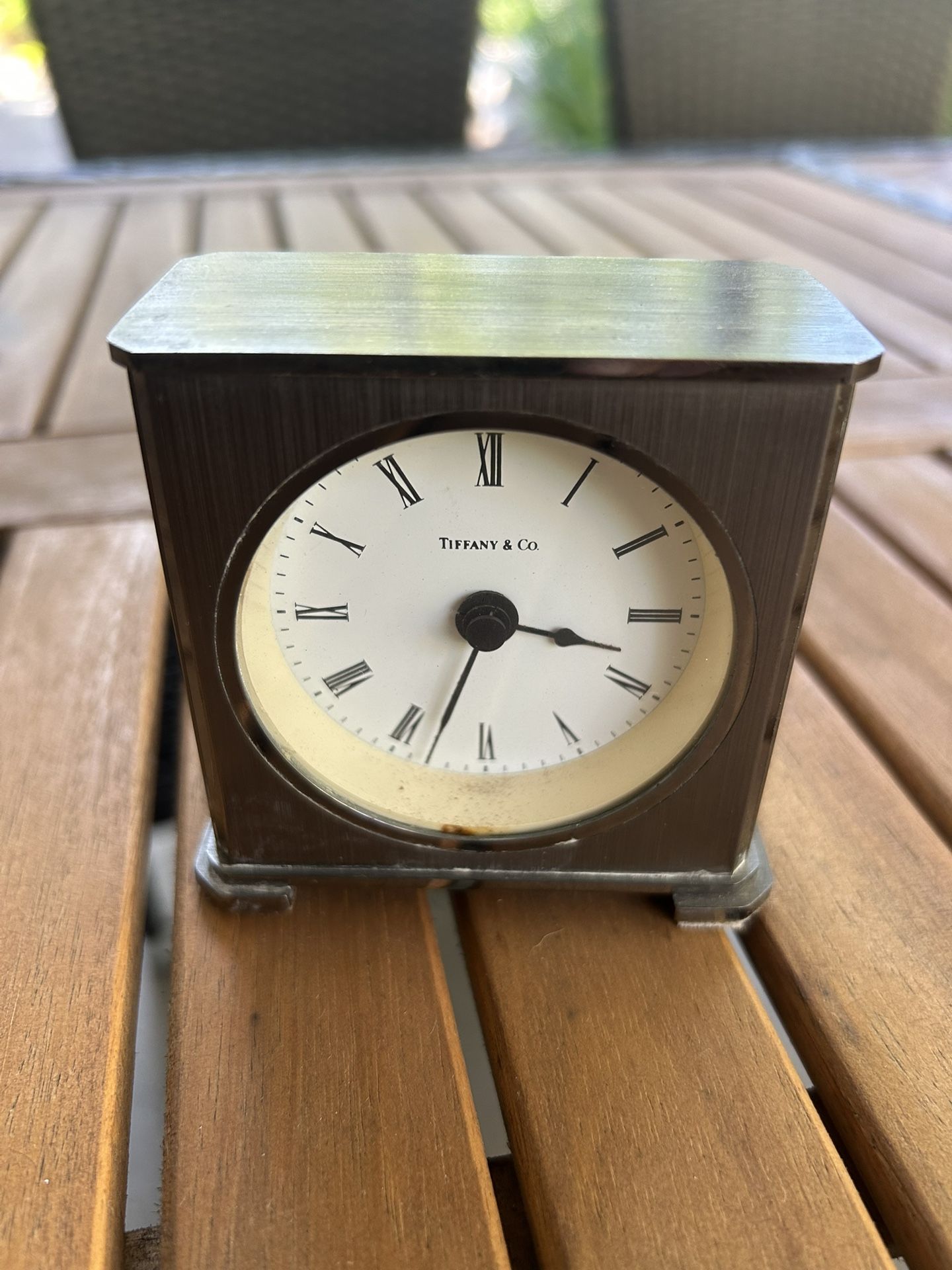Tiffany & Co. desk clock with a gunmetal finish is in decent condition (the clock stopped working) and measures 3 inches wide by 3 tall by 1 1/2 inches deep. The clock face features black Roman numerals and hands. It utilizes a quartz movement and has a hinge back closure. Similar Tiffany & Co. "Portfolio" models have been made in Germany. Clocks like this are often considered collectibles