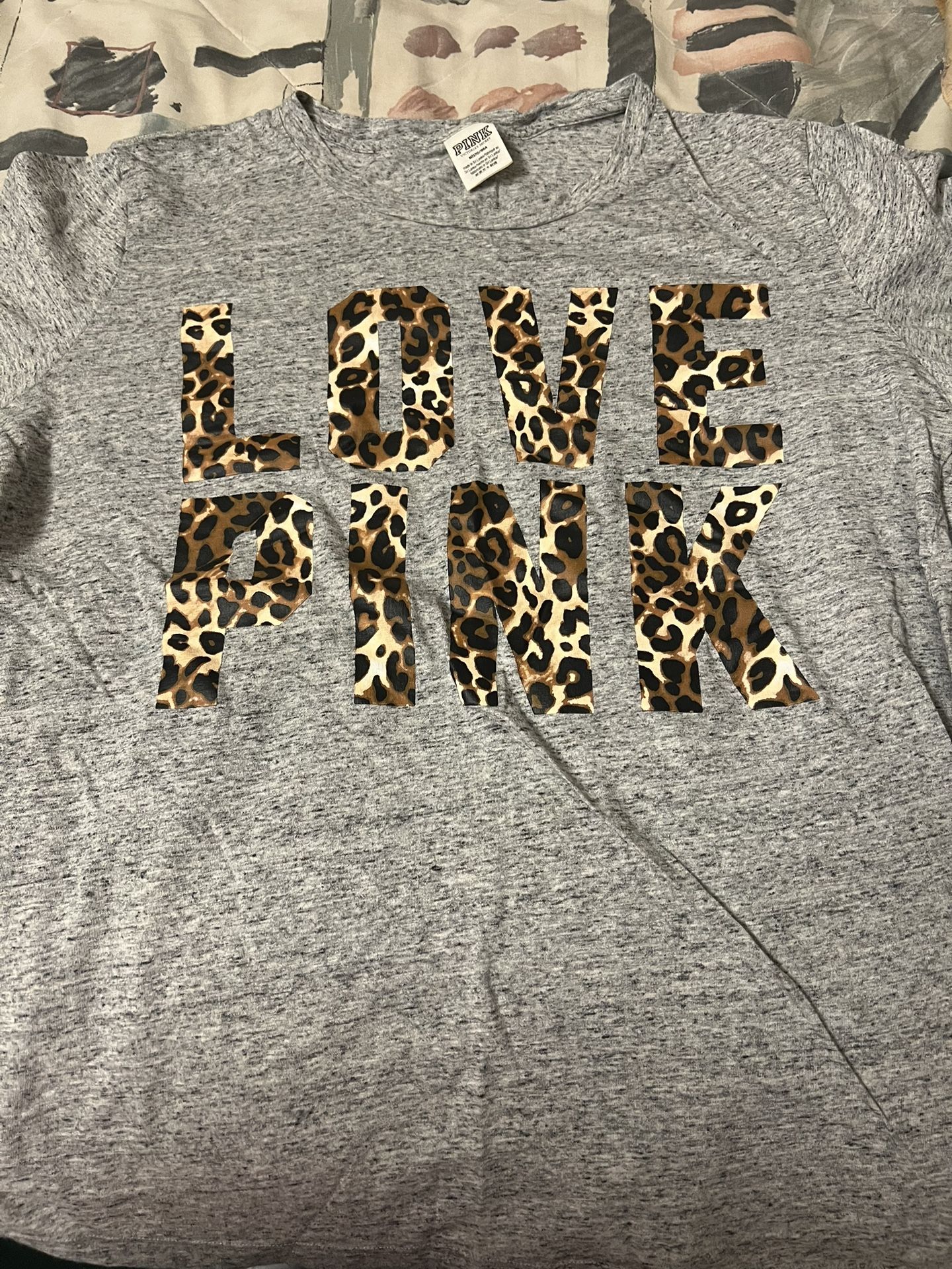 Selling Victoria's Secret Pink Campus Short Sleeve Tee https://offerup.com/redirect/?o=U2hpcnQuSXQ= is leopard/animal print Worn a couple time. Size M but oversized . Check pictures for details and condition.Asking $12 Meet up in Stockton. Can ship serious buyers only plz