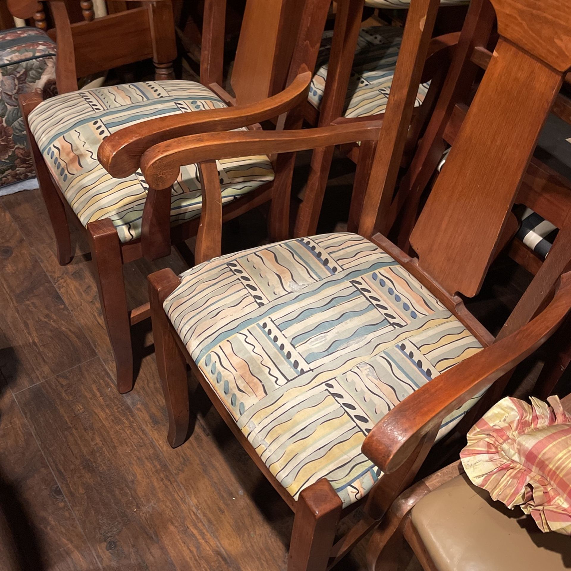 4 are Armchairs, 2 are armless. All solid wood made in Italy in very good condition Different fabric on 2 of them. I would replace all to match
