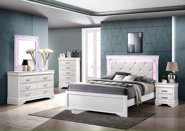 Features: RGB Changing Light Headboard RGB Changing Light Mirror Snakeskin front casegoods drawers Index: 5 Piece Set Includes: Bed, Dresser, Mirror, Nightstand, Chest