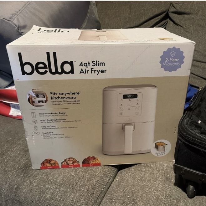 Bella 4qt Slim Digital Air Fryer in Oatmilk, featuring EverGood Ceramic Nonstick Coating. This compact, space-saving kitchen essential is perfect for small countertops without sacrificing capacity. Equipped with 6-in-1 cooking functions including Air Fry, Bake, Roast, Broil, Dehydrate, and Reheat. The EverGood ceramic nonstick coating is PFOA and PFOS free, ensuring a healthier cooking experience and easy cleanup. Features an extra-long basket design for larger batches and a user-friendly digital display for precise temperature control up to 400°F. Condition: New in box. Package shows a 2-year warranty from the manufacturer.