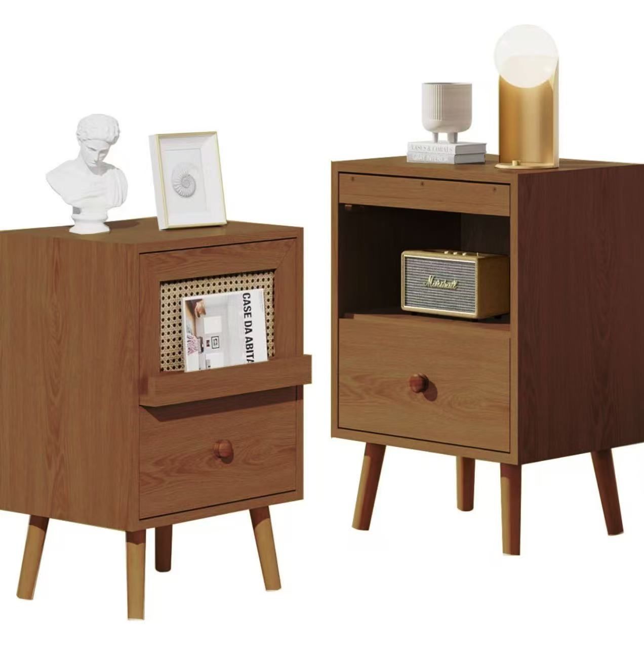 Brand :Anbuy Product Dimensions :11.8"D x 15.7"W x 23.6"H Frame Material: Engineered Wood Color :Walnut Top Material Type:Rattan Recommended Uses For Product :nightstand, side table, accent table ✅【Classic & Stylish Nightstand】The door of night stand is made of natural rattan with the boho-style. black, brown and oak cabinets available, a sense of seniority comes out, it can match any style of your home. Anbuy's simple yet elegant design will complement any decor as a sofa side table or nightstand. ✅【Compact & Spacious】The nightstand’s upper door can be pushed to the top to form an open shelf, or closed to form a closed space. The handle design on the door can place your mobile phone and magazines.There is a drawer with metal handle under the nightstand, provide you with ample storage space to tuck away all your nighttime essentials in style. ✅【Versatile Applicability】Overall size: 15.7 "W x 11.8" D x 23.6" H ,the height matches most of beds, sofa and chair. This end table is a versatile and elegant addition to any bedroom, living room, or home office as a nightstand, side table, or accent table for organizing bedtime essentials. It's versatile enough to fit any style - from modern mid-century bohemian to classic timeless displays. ✅【Strong & Stable】 The structure of the nightstand has been tested professionally, stable and firm. Four legs made from solid wood are stably placed in a splayed shape to prevent wobbling. This nightstand is constructed durable eco-friendly wood material,which is solid and durable while maintaining the design.