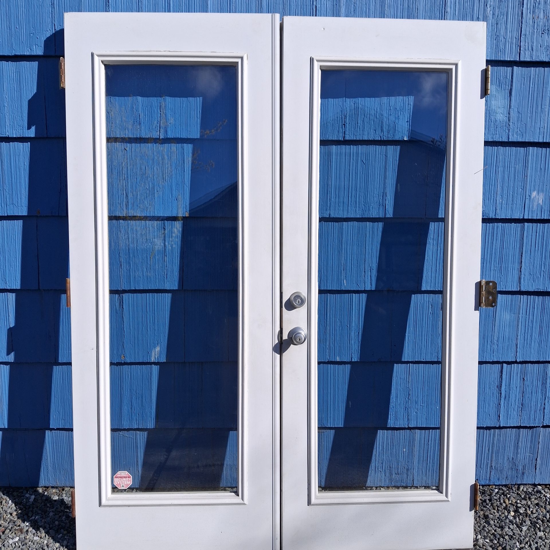 Excellent condition Opens out Double Pane low E tempered glass with Hinges Latches Locking handle Dead bolt Steel Door fire rated 60x79-No frame