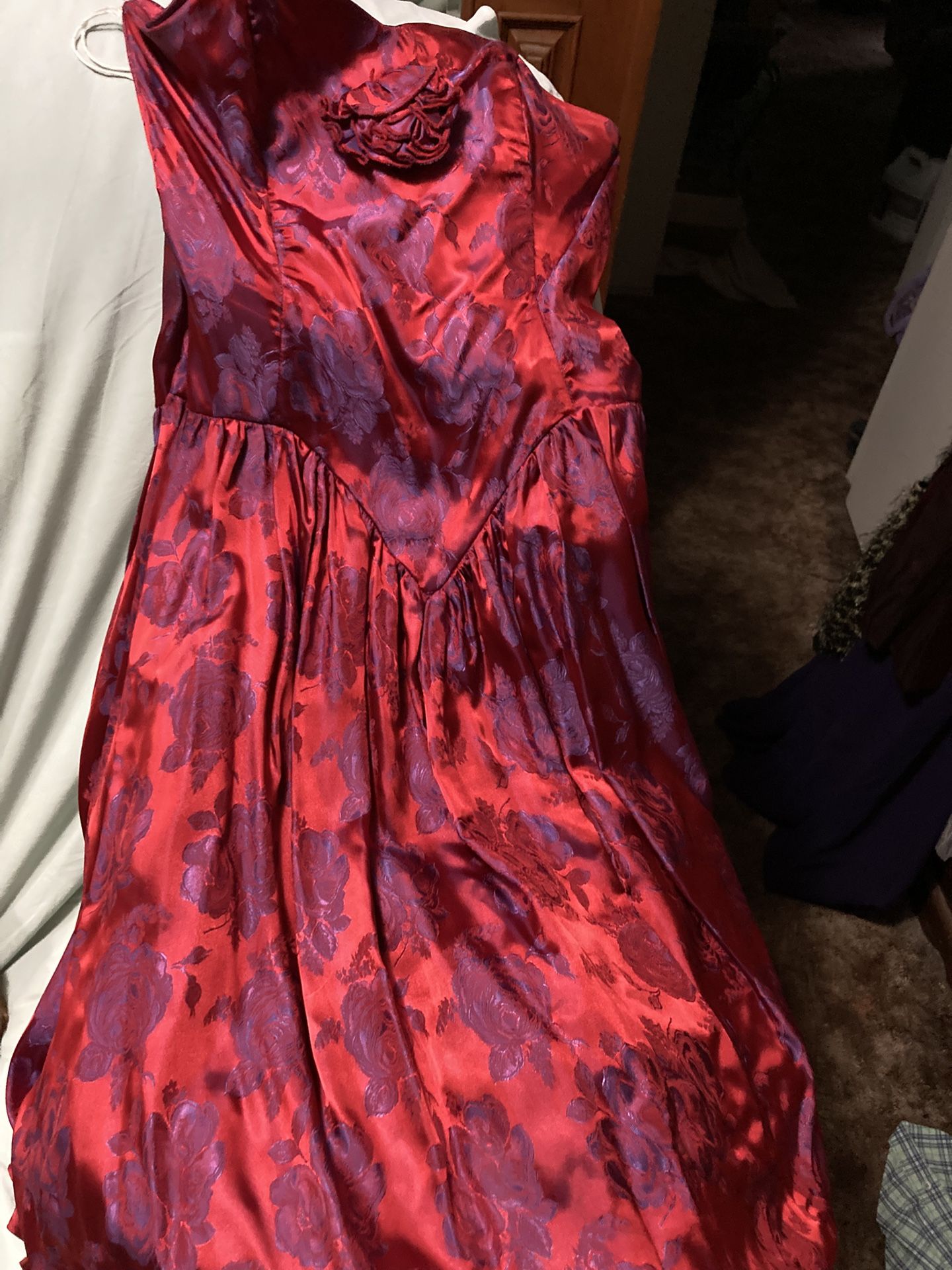 Bright red dress strapless perfect for a party size. I believe it’s between an eight and a 10.