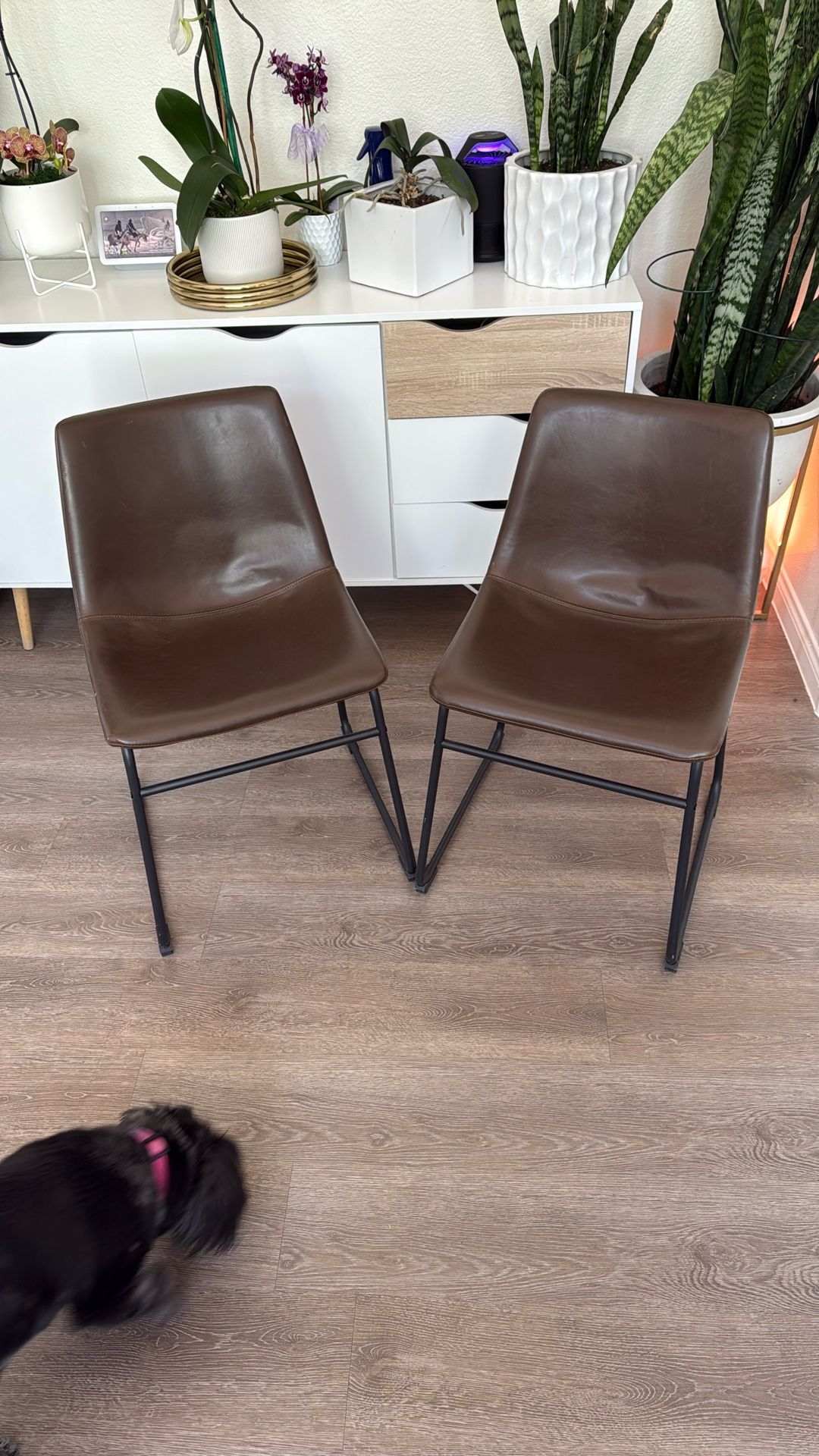 Seat height 18 inches, seat depth 15 inches and seat back height 15 inches. Great condition. Faux leather with metal legs. Local pick up only. No delivery, no shipping. Located near downtown summerlin. Price is for both chairs. $25