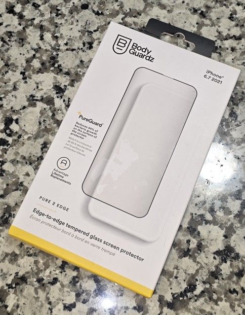 Brand new BodyGuardz Pure 2 Edge tempered glass screen protector for Apple iPhone 13 Pro Max and iPhone 12 Pro Max. Edge-to-edge protection with antimicrobial PureGuard technology. Includes installation kit. Retail $50 — selling for half price. Ready for a new home!