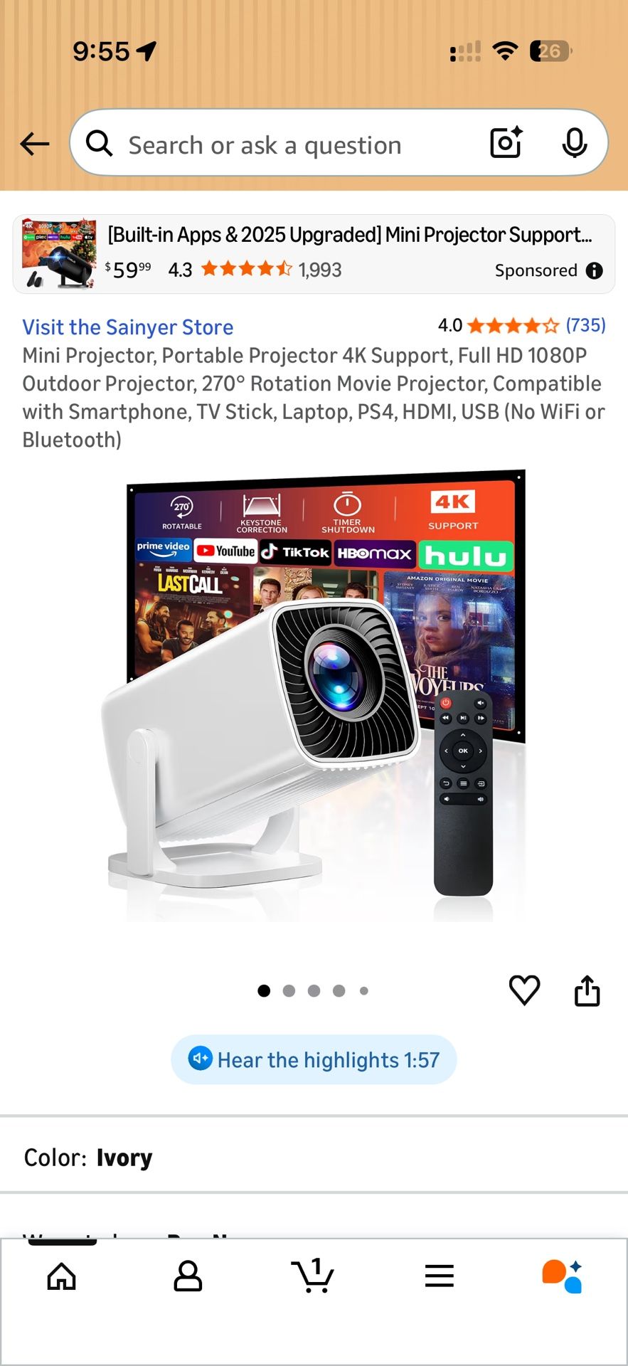 Mini Projector, Portable Projector 4K Support, Full HD 1080P Outdoor Projector, 270° Rotation Movie Projector, Compatible with Smartphone, TV Stick, L