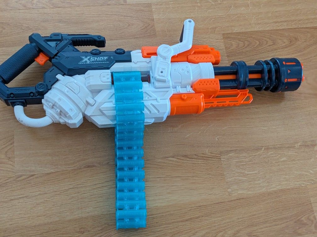 Better than a Nerf. Machine gun style with continuous chain ammo belt. Works but does get jammed once in a while.