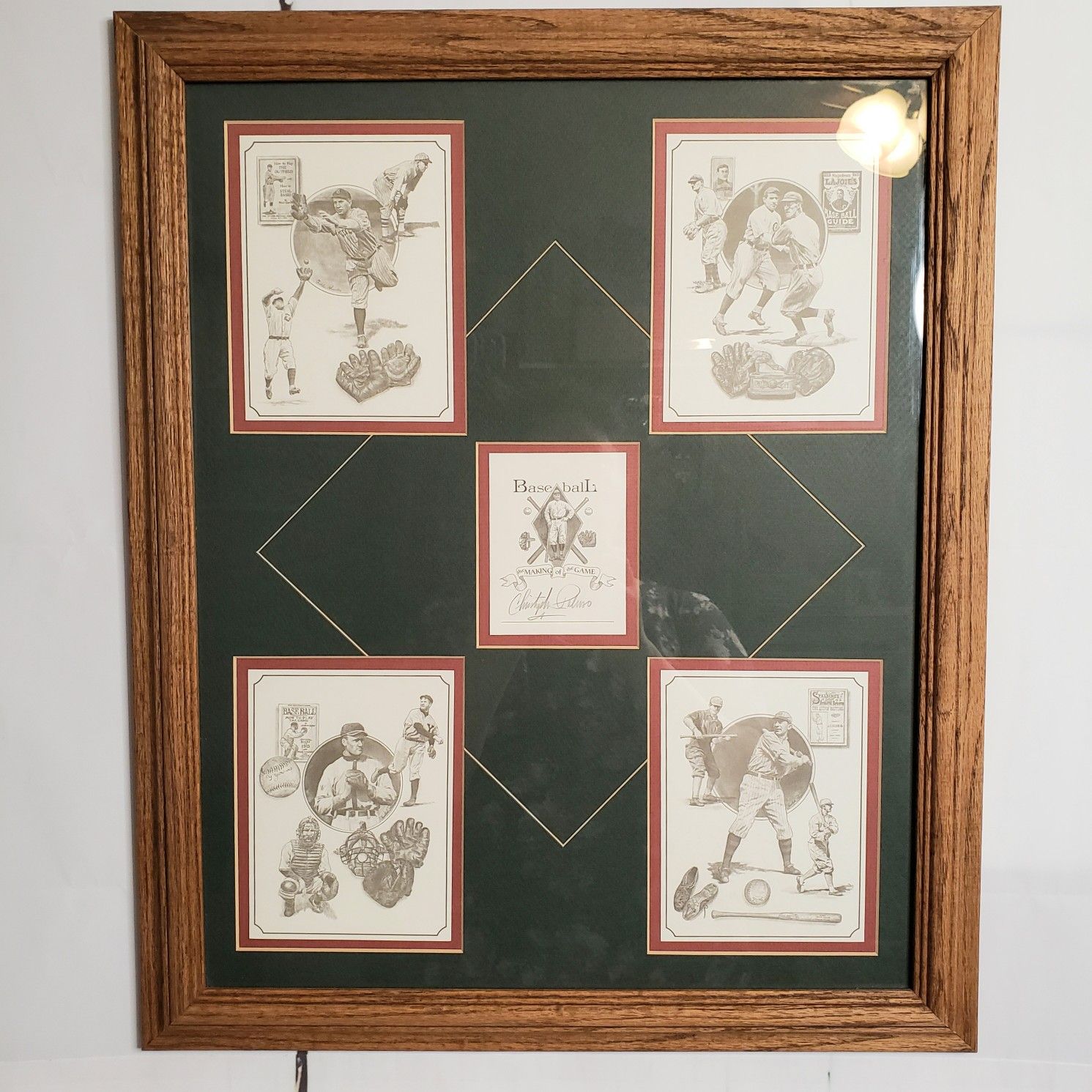 VTG: "Baseball, The Making of the Game" by the artist, Christopher Paluso. Amazing professionally matted & framed collectible portraying four art prints 4.5" x 6" of baseball legends: Wagner, Johnson, Keeler, Evers, & Chance. The middle card 3" x 4" contains the title & signature (not authenticated) of the artist in pencil with a custom diamond theme/paper backing. In adored condition: artwork & wooden oak frame is intact. **Disclosure: there's tape on the back. Approx. Dims: 18.5" × 22.5"