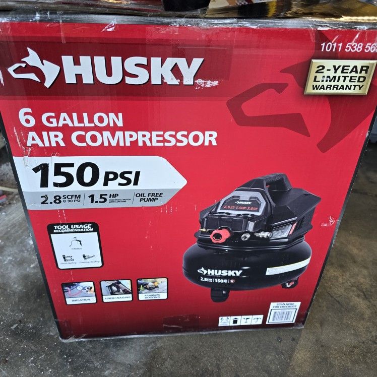 New Huskey 6 Gal. 150 PSI Portable Electric Oil-Free Jobsite Pancake Air Compressor with Dual Pressure Gauges and 2-Quick Couplers Asking 100
