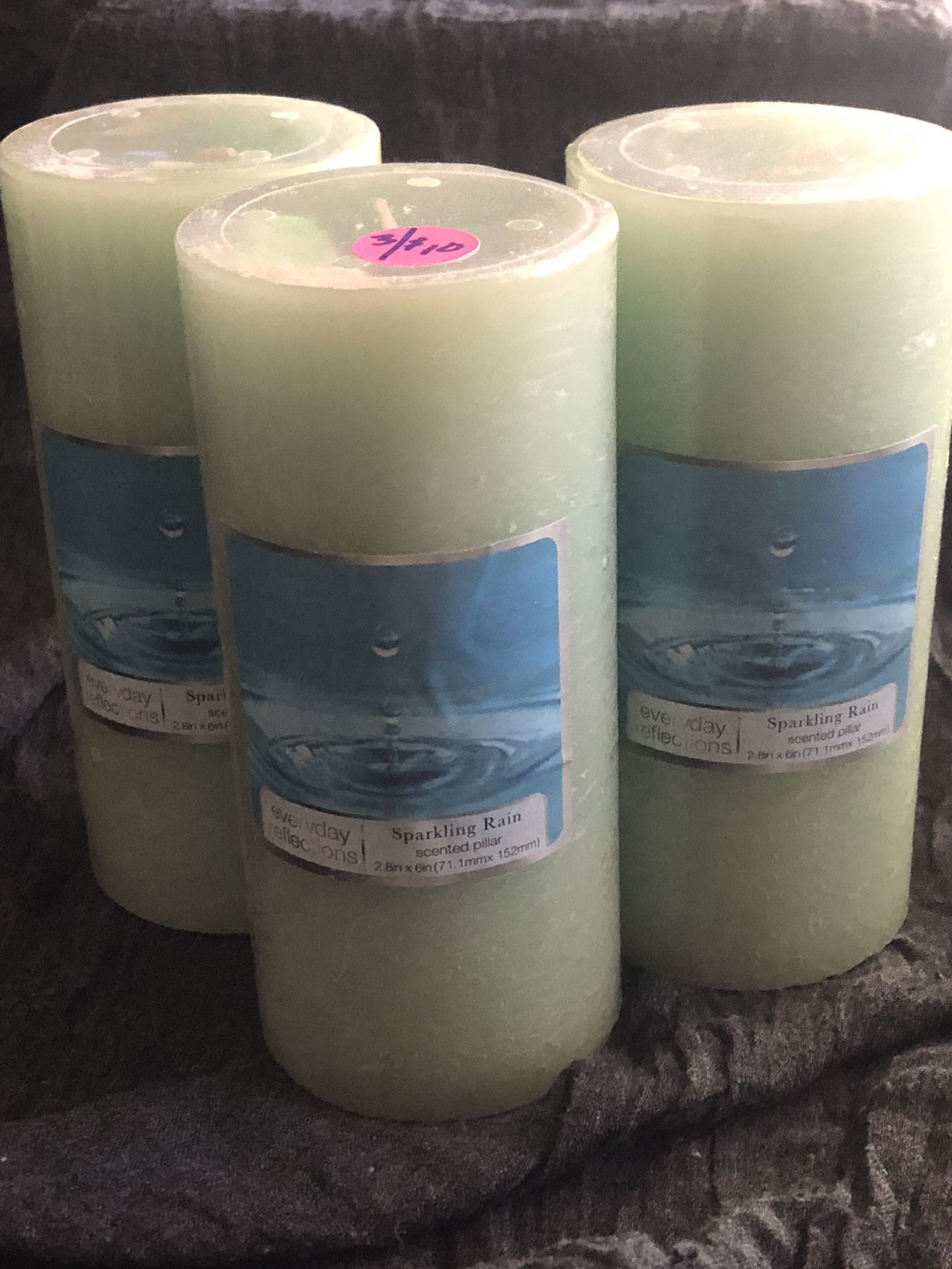 Set of three pillar candles, pale sea green, 6” tall All prices negotiable. Discounts for multiple purchases.