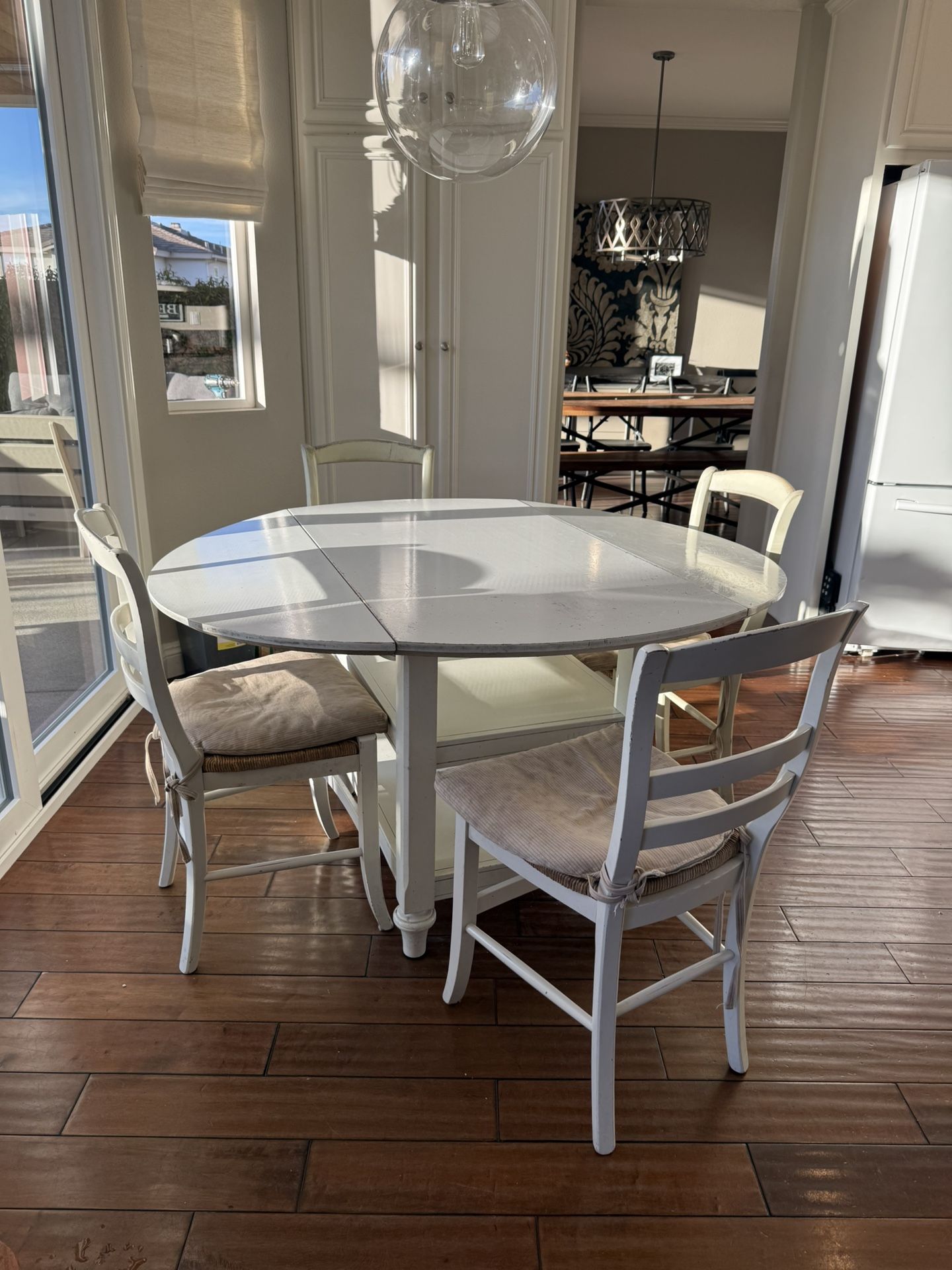 Well-loved Pottery Barn dining set with table and 4 chairs. 54” round table withhh 2 shelves and folding sides. Solid wood.