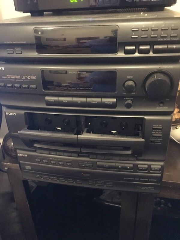 Sony Audio Player. Works well. Black. AM/FM Receiver, Duel Cassette, 5 Disc CD Changer. Has 2 Speakers. Cash & Carry.